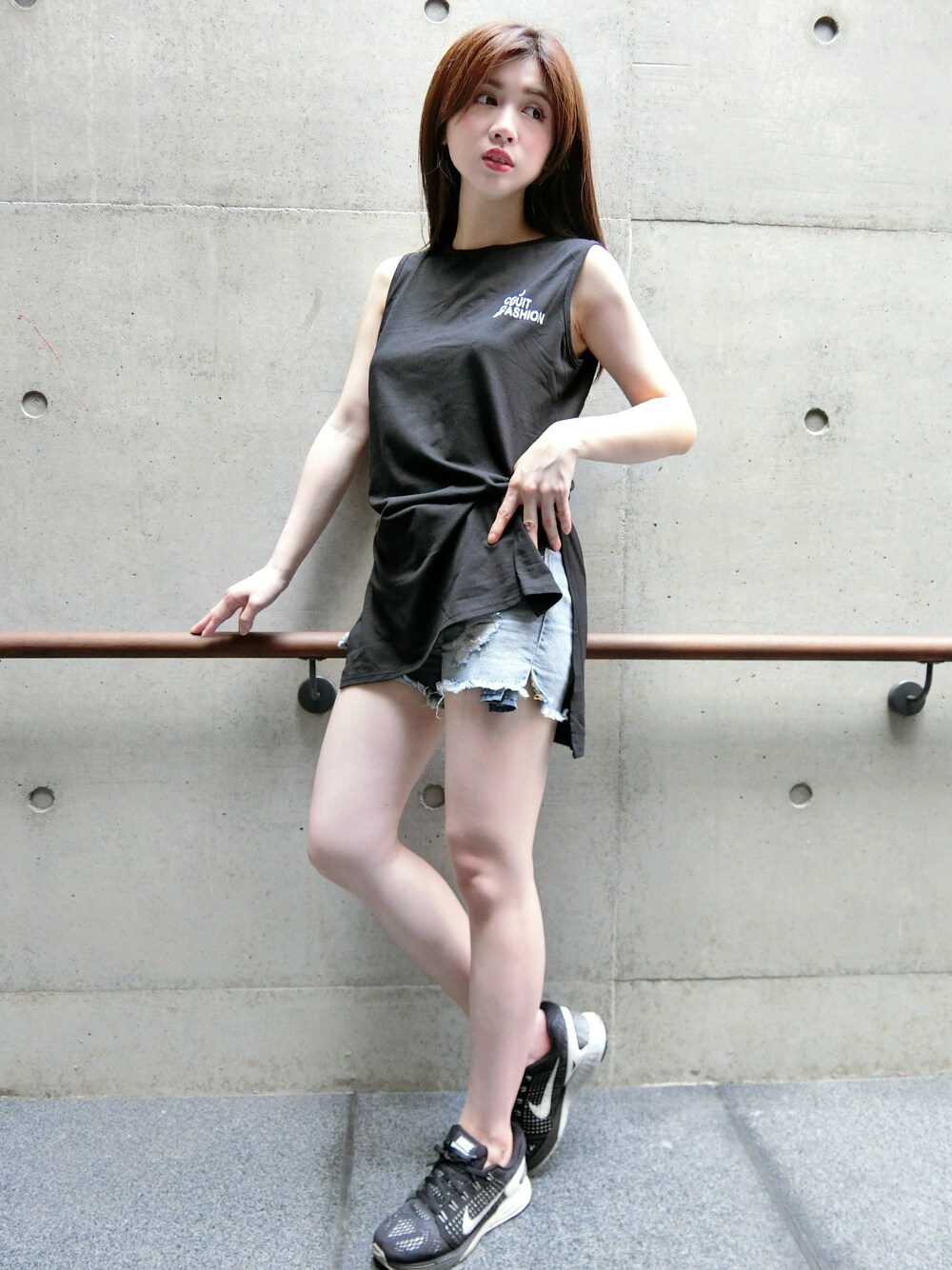 長款無袖T恤背心裙,搭配牛仔褲運動鞋。FB@Letisshop