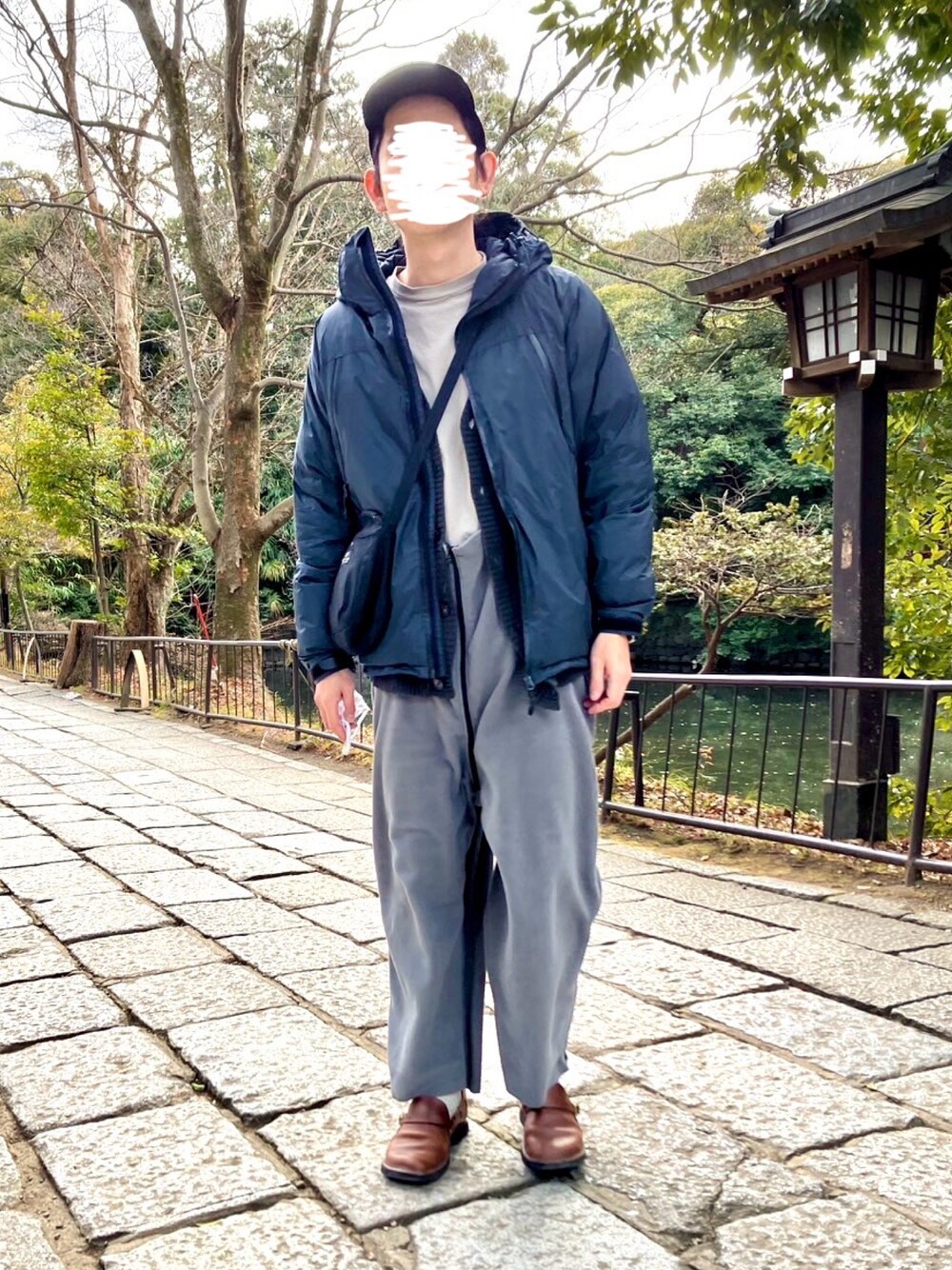 暖かさ重視でダウンジャケットとフリースサロペットの組み合わせで、色も落ち着いた配色にしました。 カジュアルさを出せればと、靴は茶色にしました。
