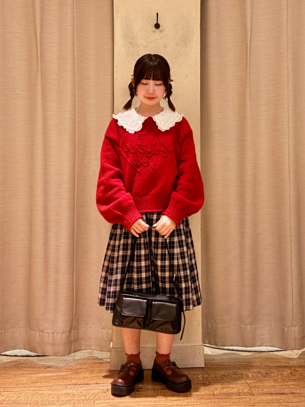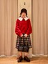 ご覧いただきありがとうございます🌳 最近流行りのミディアム丈のスカートが入荷しております🍂 こちらのスカートはちょうどニットに隠れてしまっているのですが前側のサイドにリボンがついておりチェック柄だけでも可愛いのに更に可愛さがプラスされております☺️🎀 赤のニットもシルエットがタポっとしておりとても可愛いです🍎♥ 私はガーリーすぎるのが好きなのでフリルの襟ブラウスを中に重ねておりますが、襟を付けなくても充分に可愛く着ていただけます! 気になられた方はぜひ店頭やオンラインでチェックされてください✨