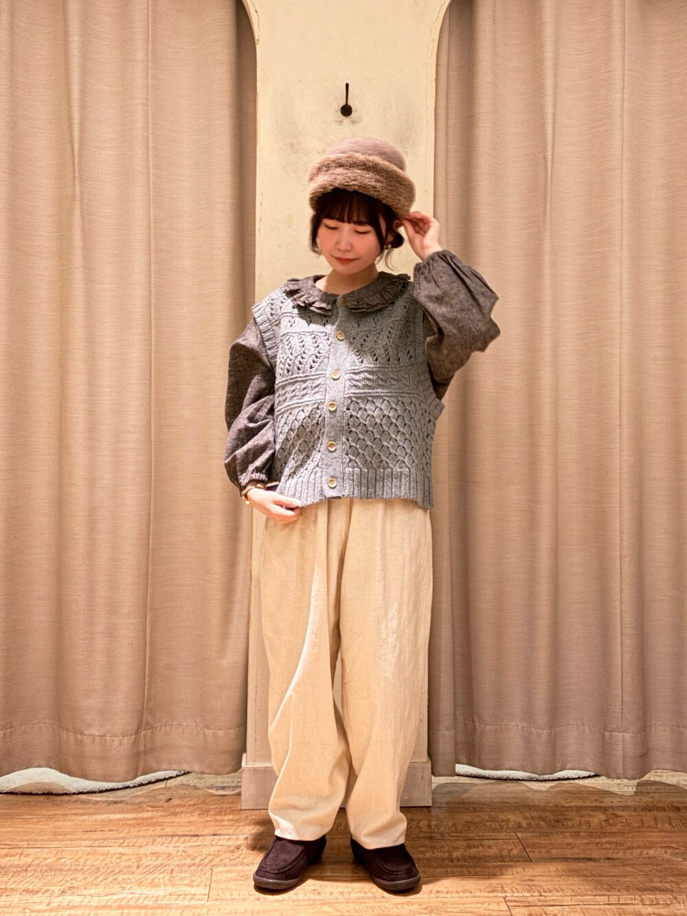 ご覧いただきありがとうございます🥣 フリル襟が可愛いブラウスをカジュアルガーリーに組み合わせました!♡ 中のブラウスは前側にフリルが着いているのでベストのボタンを開けて羽織っても可愛いです🙆🏻♀️ パンツは全体的にゆるっとしたシルエットですが下に向かって絞られているので少しスッキリ着ることができます! ぜひ店頭やオンラインでチェックされてください🧺