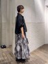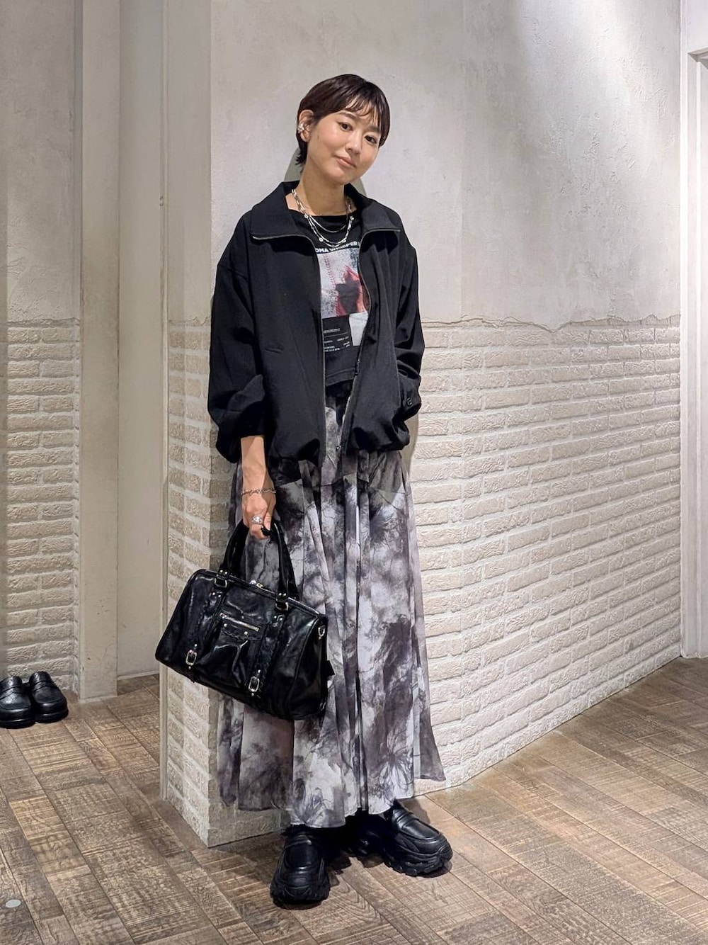 オールブラックでも柄や フォトプリントアイテムを選べば スッキリ軽やかな印象に♡ アウターは薄手の生地でサラリと羽織っていただけます