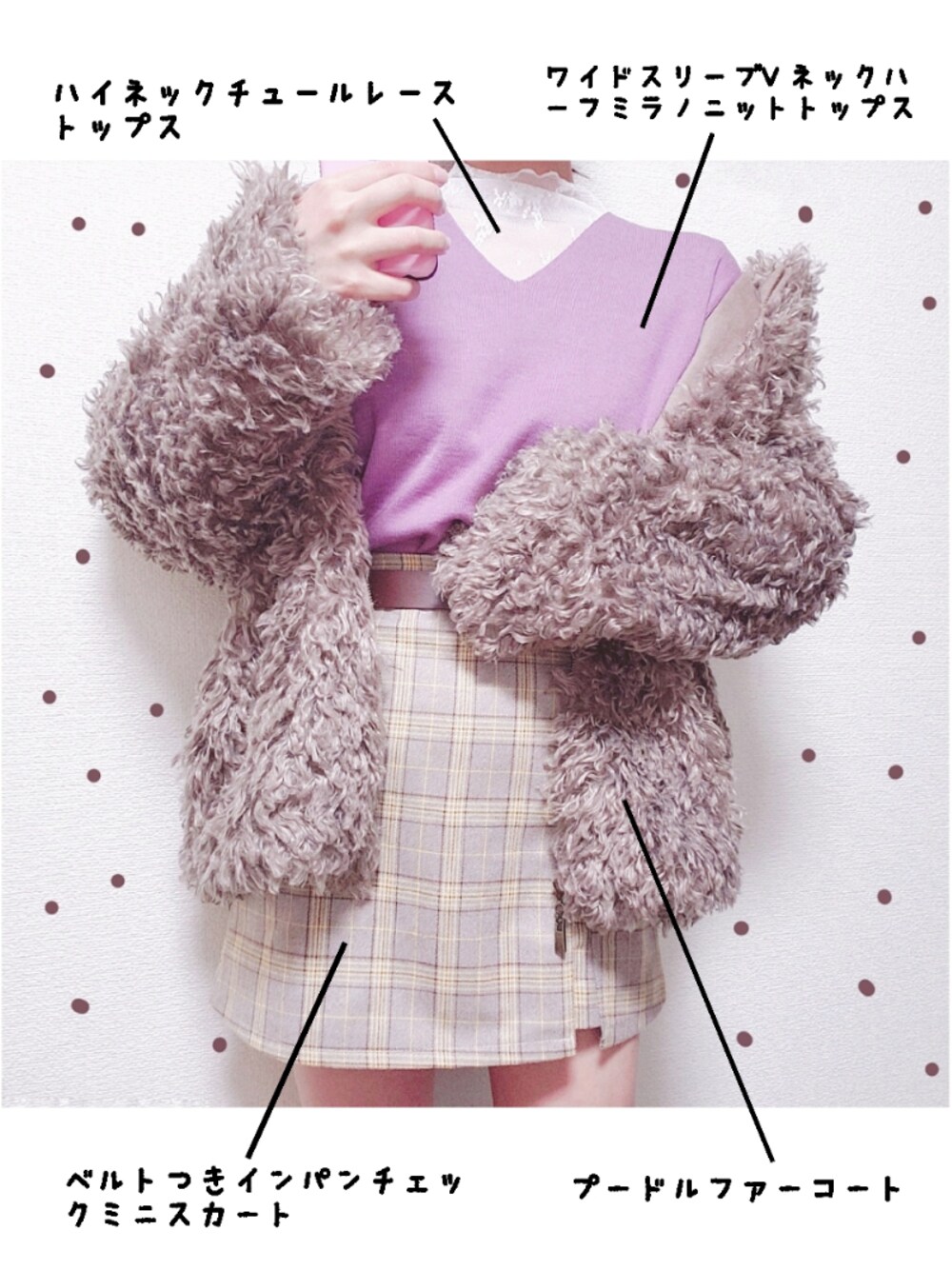《今日のコーデ》 outer*プードルファーコート in*ハイネックレースチュールトップス top*ワイドスリープVネックハーフミラノ ニットトップス skirt*ベルト付きインパンチェックミニ スカート