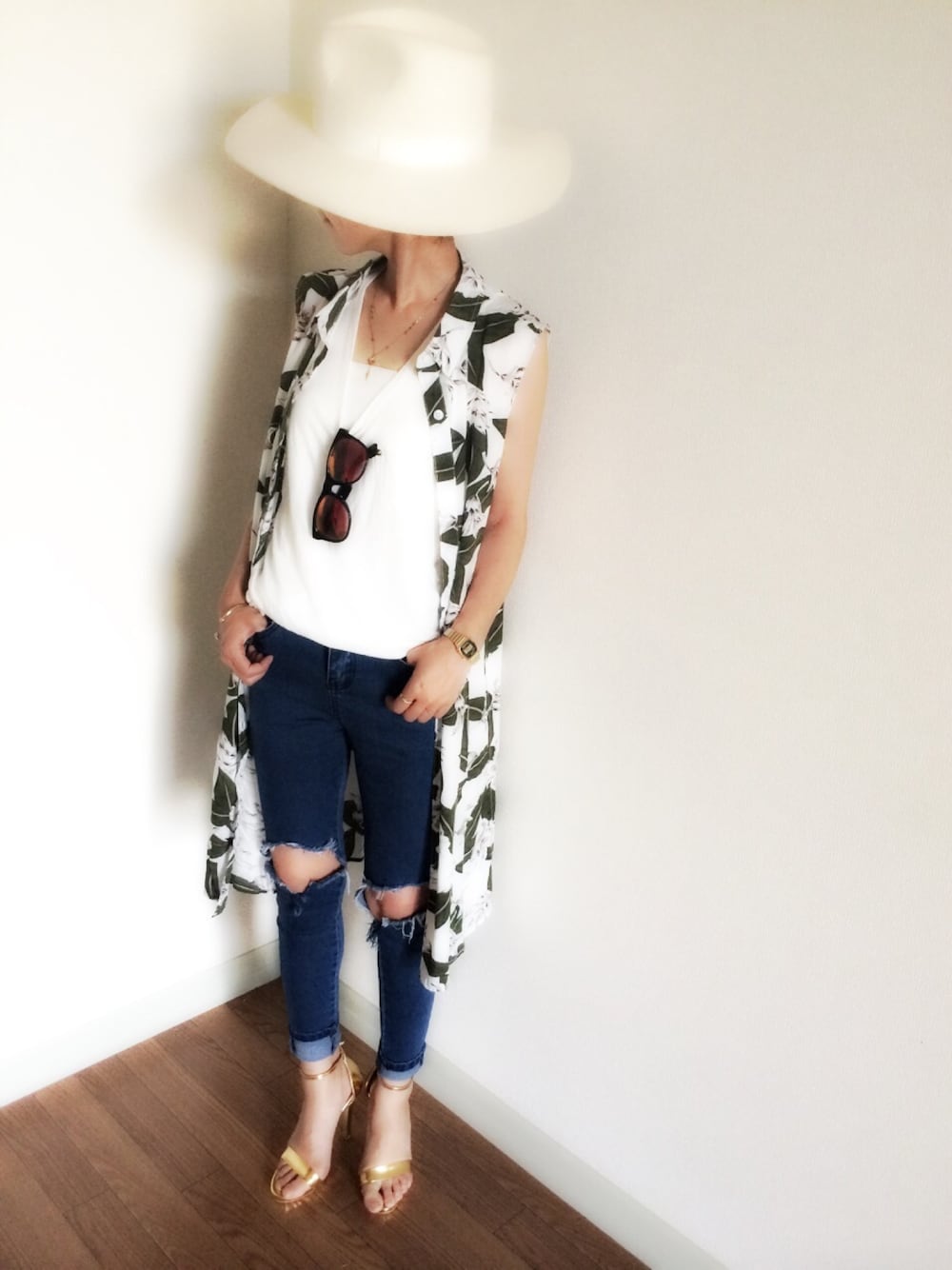 EXSOMEのリーフ柄ロングシャツを メインに組んだコーデ♡ 夏らしい柄が可愛い♡
