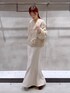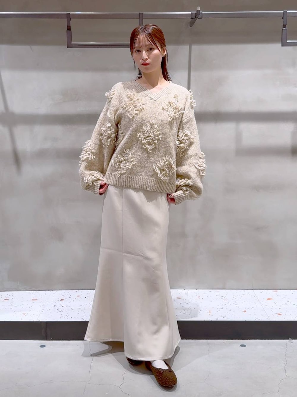 大人フェミニンコーデ 🎀 【ニット】 FREEサイズ 大ぶりのぽこぽこデザインが可愛いあったかニット。 Vネックなので、顔周りスッキリとした印象で お使い頂けます^^♡ とっても軽くて肌触りも柔らかいので着心地◎! なアイテムです♪ 【スカート】 Mサイズ 履くだけで細見えする、 美シルエットのマーメードスカート。 シワになりづらい素材でお手入れも楽ちんです!◎ 私は長めの丈感で履きたかったので Mサイズにしました!