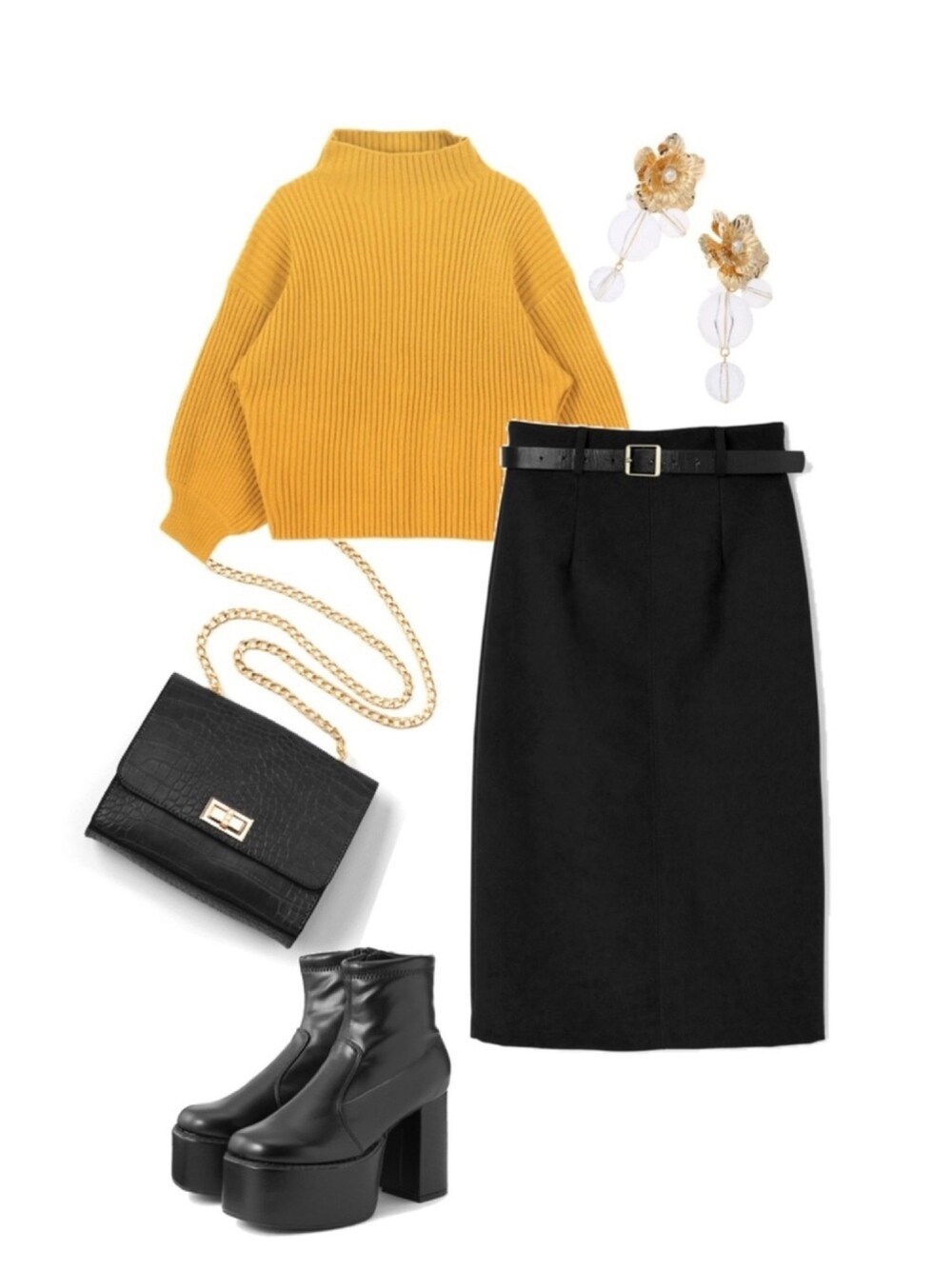 🌷閲覧ありがとうございます🌷 〜プチプラコーデ〜 ✅ボトルネックリブニット 価格3,289円 (税込) ✅ ベルト付きバックスリットスカート 価格1,399円(税込) yellow×black 🟡⚫️ これを着ればオシャレ上級者に🌷
