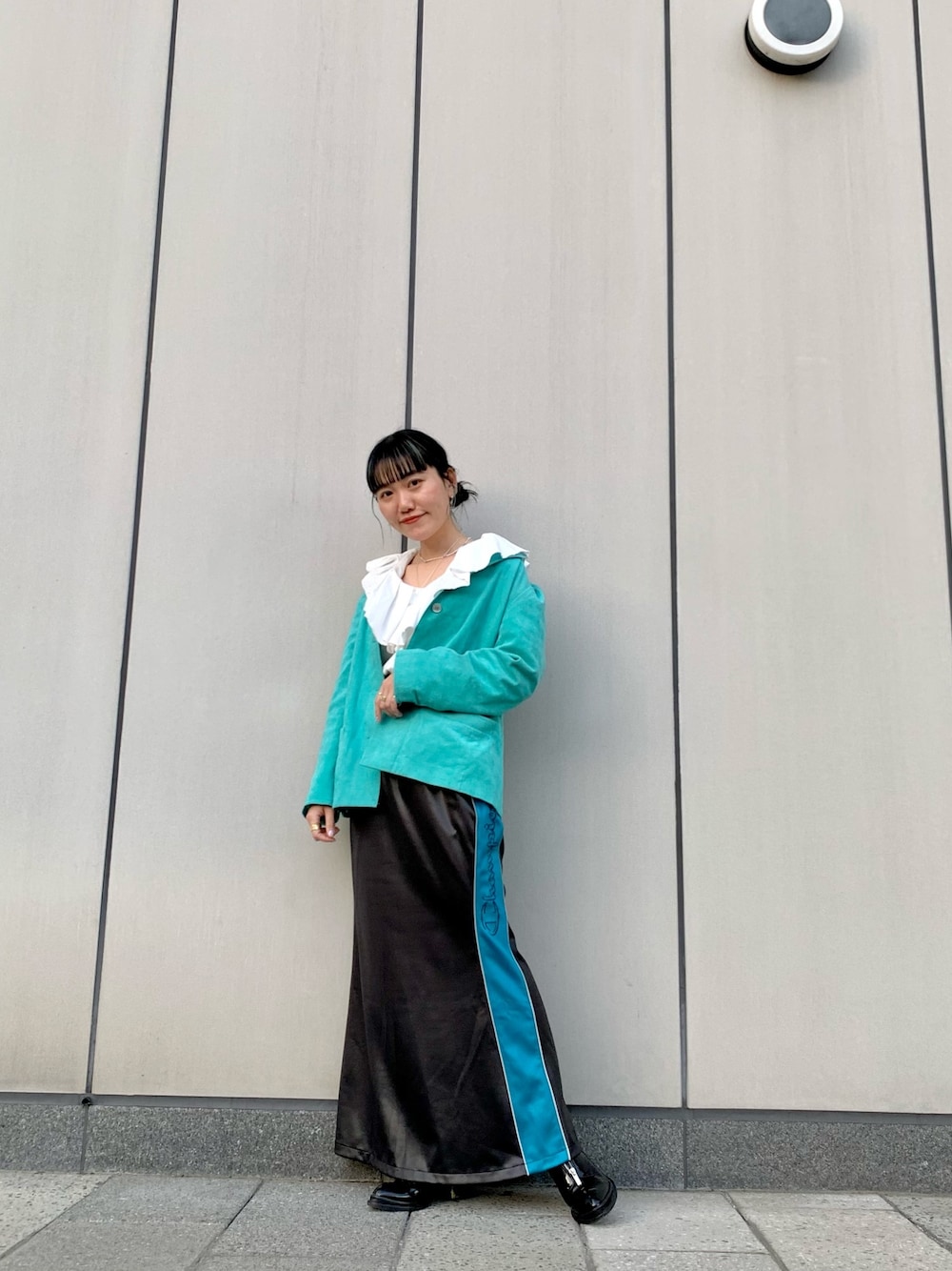 お気に入りの衿フリルカットソーは ジャケットとジャージスカートで 甘くなりすぎないスタイリングにするのがキブンです🐬💙