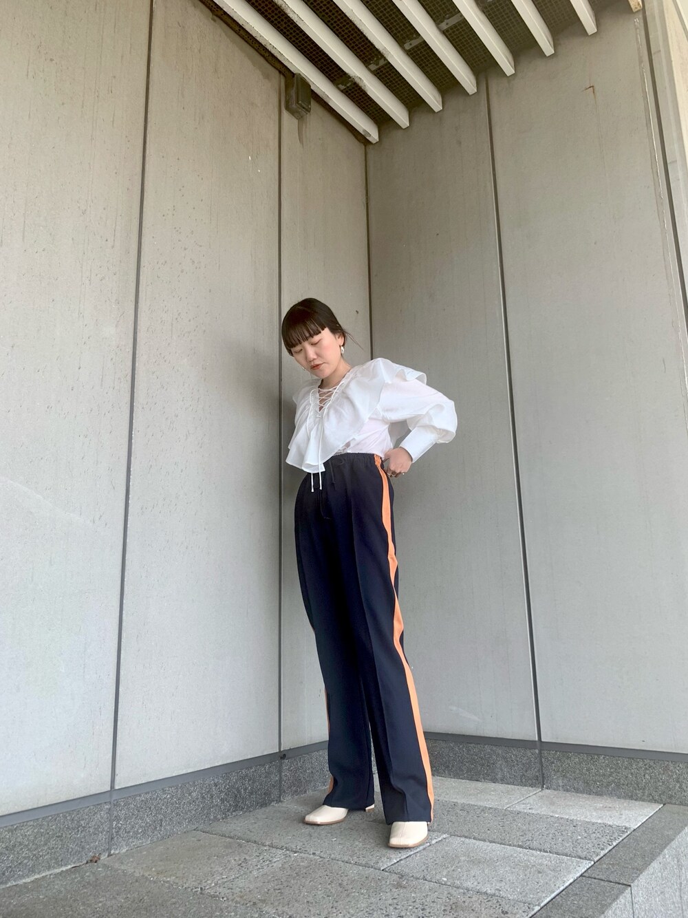 ずーっとしたかった ブラウスにジャージのスタイリング ジャージなのに細身できれいに見えるの 最高にお気に入りです、、、💓 小柄さんはウエストぎゅん上げのヒールありでどうぞ。