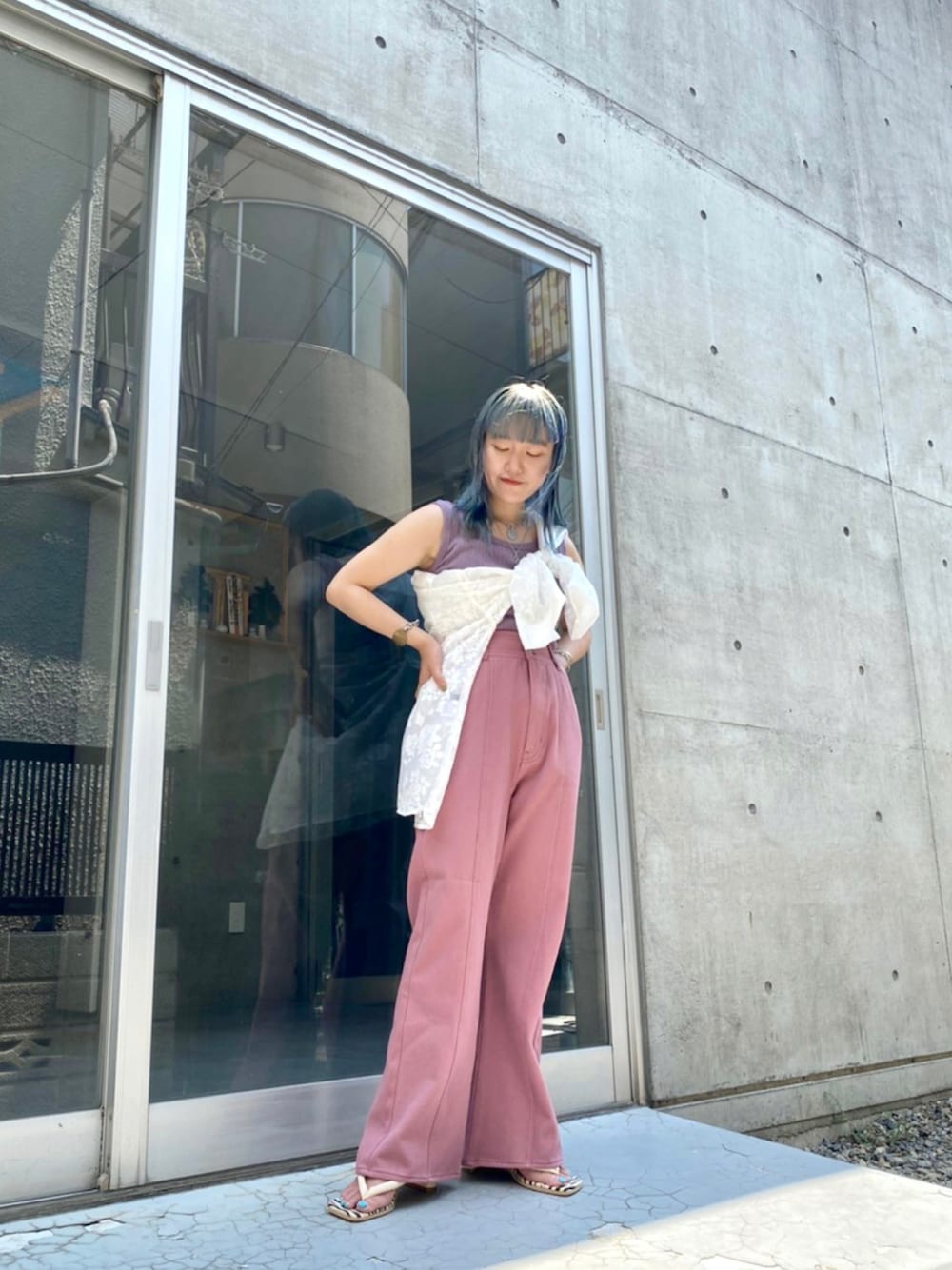 夏はタンクにシャツたすき掛け☝️ 去年もこの時期この色合わせ好きだった〜👚💜 ポップにならないピンクとパープル 馴染みやすくて🙆♀️