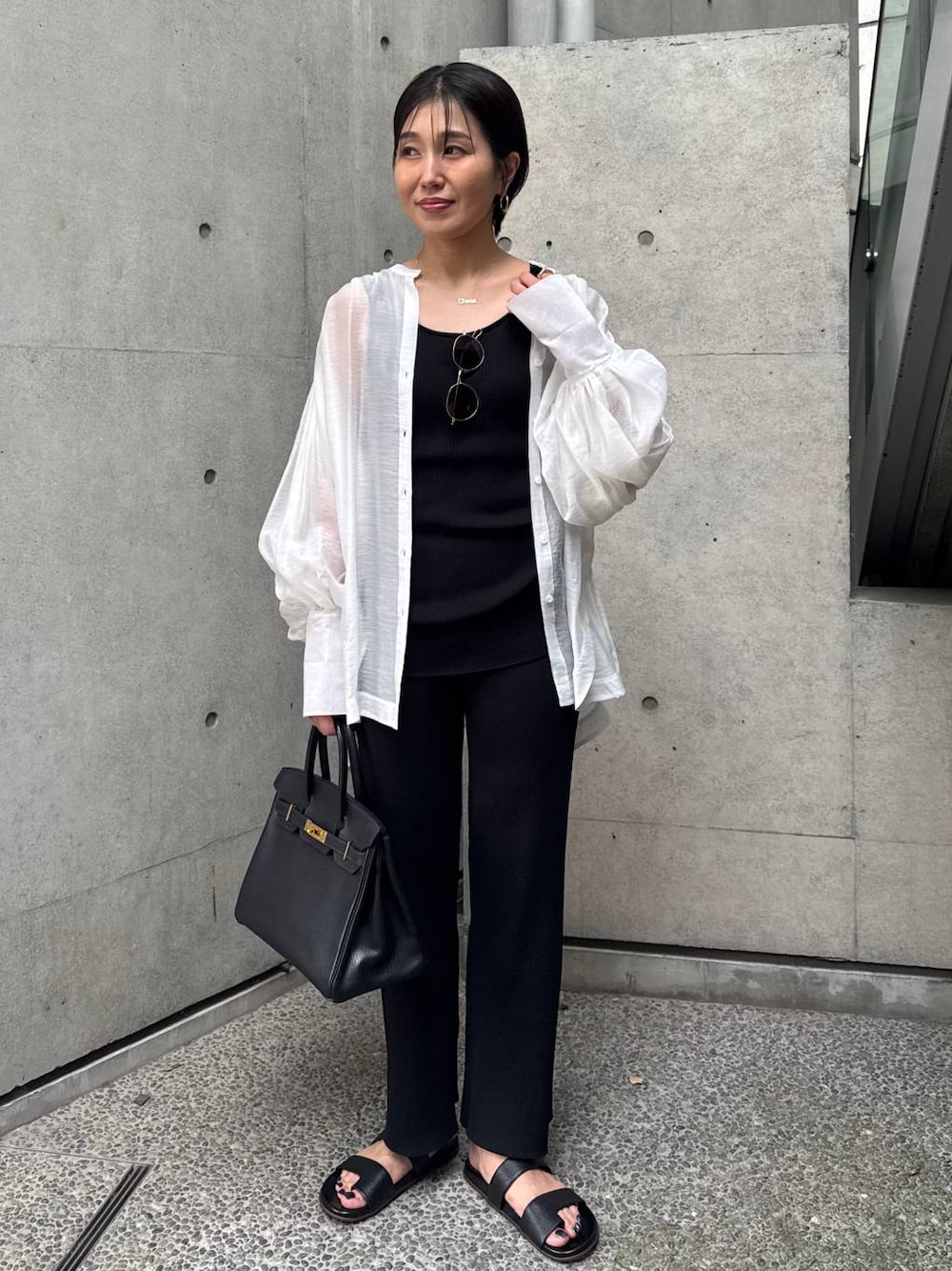 ブラウスをポイントにした大人のモノトーンスタイル🤍 レベッカブラウスは、ギャザーがたっぷり入っていて、お袖がホワっと広がる感じがとても可愛いです! ロマンティックな印象ですが、細かく寄せたギャザーが広がり過ぎず、シアー感もあり、甘くなり過ぎずに着用いただけます。 サラッとしていて、夏の羽織りにもぴったりです。 ブラウスのデザインがとても素敵なので、インナーはシンプルにインプレリブSET UPが◎。THEROWのサンダルとサングラスで抜け感をだしてます。 bag: VINTAGE HERMES shoes:THEROW sunglasses:AHLEM