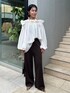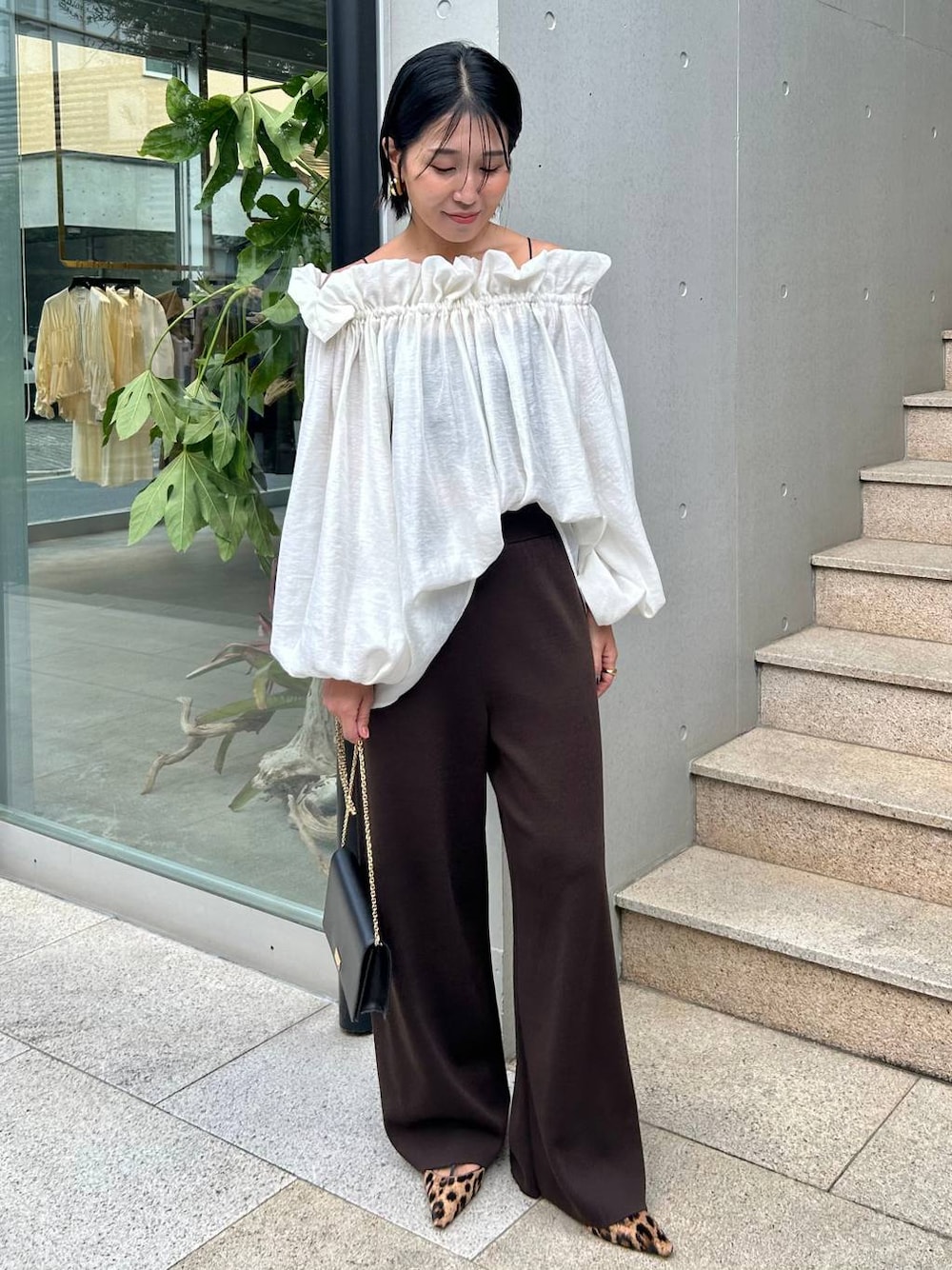 初秋のリラックスstyling🍂 “ナロパブラウス”は、春にもご好評いただいたオラパブラウスの素材違いで、前回より落ち感のあるテクスチャーになり、残暑な秋にもとても着やすい素材感です✨ 衿のフリルが華やかな印象で着映えし、カジュアルからフォーマルまで楽しめます。 着方はヘルシーに少し肩を見せるオフショルダーがオススメです☺︎ レニーリバーパンツは、表が梳毛ウール、裏がコットンのダブルフェイスでチクチク感のない滑らかな肌触り◎、パターンとシルエットに拘り、楽ちんでありながら綺麗見えする大人のニットパンツでオススメですよ! 華やかなブラウスに、あえてリラックス感のあるニットパンツを合わせて、甘さを抑えたルーズな抜け感をプラスし、小物はレオパ柄パンプスとゴールドのチェーンバックでキャッチーなアイテムをセレクトしてます。 shoes: BRENTELLA