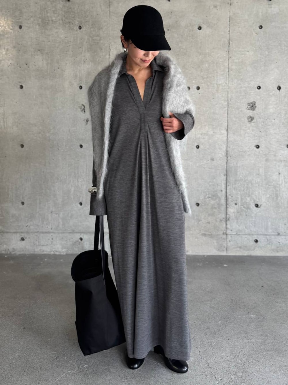 シックな大人のリラックスstyling。 大きく開いた衿つきのスキッパーデザインと、上質なスーパー原料100sウール使用の滑らかな肌触り&落ち感が特徴✨ 裾に向かって流れるようなフレアと広がり過ぎない縦長のシルエットで体型をスッキリ見せてくれます☺︎ カジュアルになり過ぎず、絶妙な大人なリラックス感のあるワンピースでオススメです!! 秋冬小物のウールCAPやロングブーツをプラスし、カシミヤニットを更に肩がけする事で、より華やかなコーディネートにスタイルUPしてくれます。 bag:THE ROW shoes: BRENTELLA Cap: ENTWURFEIN