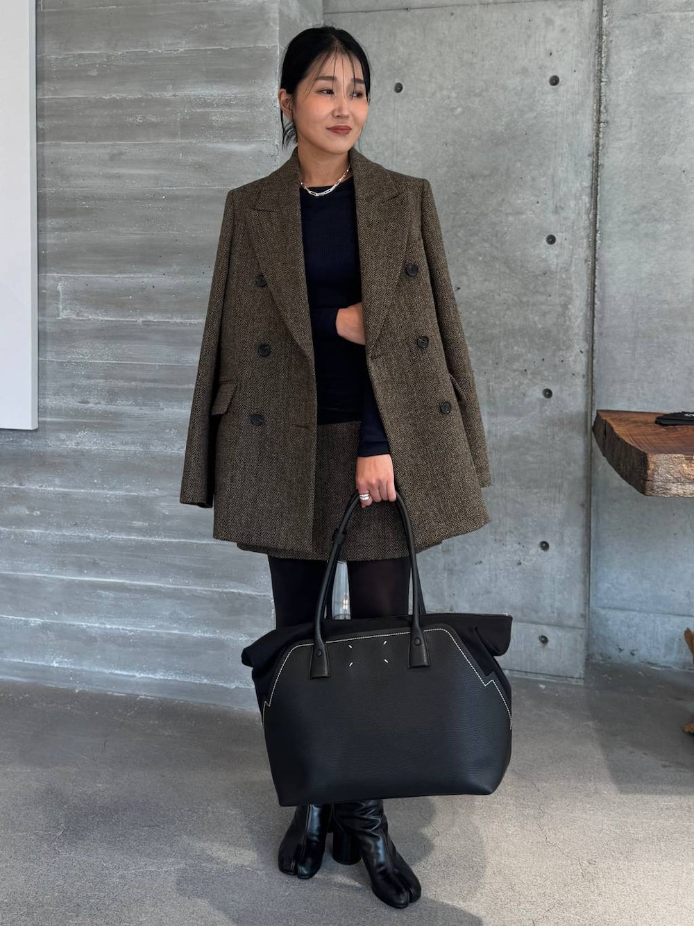 オーバーサイズジャケットとミニスカートのトレンド感溢れる旬なstyling🍂 今季大注目の”ハリスツイードシリーズ” ジャケットですが、ボリュームのあるインナーも入れられるゆとりあるサイジングで、コートとしてもお使いいただけるジャコートです! 素材は、スコットランド北西部の諸島で島民が手織りで生産する、厳しい品質基準をクリアしたハリスツイード使用しており、手織りならではの温かみある風合いと、発色のよい色合いが秋冬のムードを一気に盛り上げてくれます✨ ミニスカートを履くのはお久しぶりですが、 オーバーサイズジャケットと合わせると自然と全体のバランスも取れて、大人っぽく着用いただけます☺︎ ミニスカートにはブーツ&タイツはマストアイテム! 素肌をカバーするとチャレンジしやすくなりますね! bag&shoes: Maison Margiela