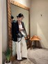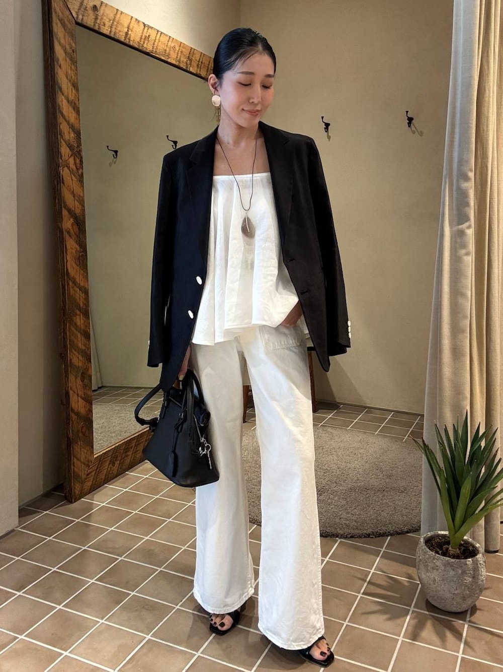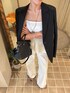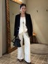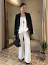 ヘルシーなオールホワイトstyle たっぷりと分量をとったフレアシルエットのトップスが動きのある華やかさを演出し、セーラーデザインのブーツカットデニムが脚のラインを美しく見せてくれるため、リラックス感がありながらも女性らしいバランスに仕上がります。 光沢感のあるメンズライクなジャケットを肩がけ、小物もブラックで引き締めて、大人のヘルシーなバランスに仕上げました。 bag: Maison Margiela ♧Instagramでもスタイリングをご紹介しておりますので、よかったら覗いてみてくださいね☺︎