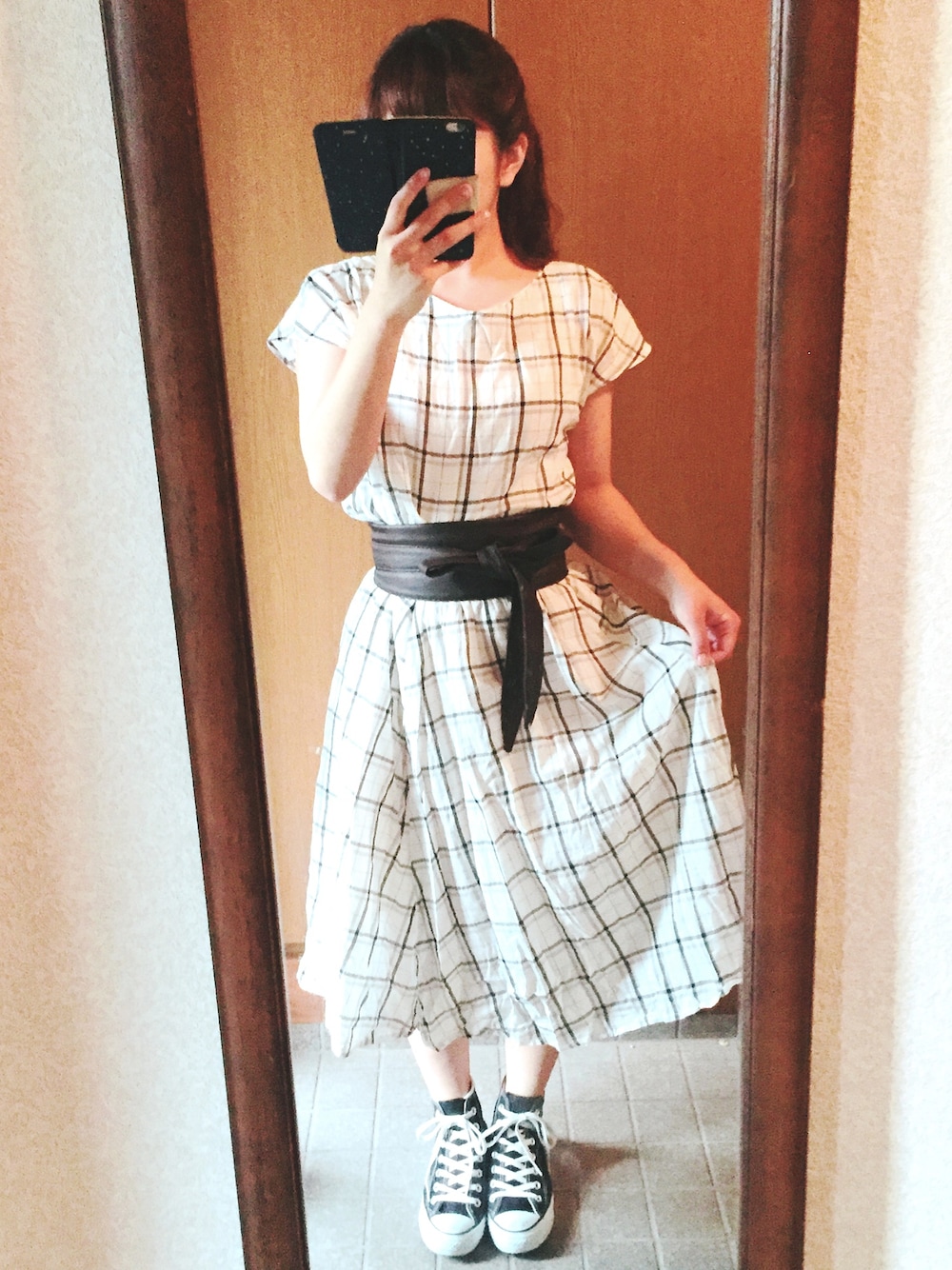 撮り溜め④ ワンピースについてるリボンじゃなく サッシュベルトを巻くことで 今年風のコーデにしました! ヒールを履いちゃうとおめかし感が増すので 敢えてハイカットスニーカーを履いて 崩してラフコーデにしました😌🙌
