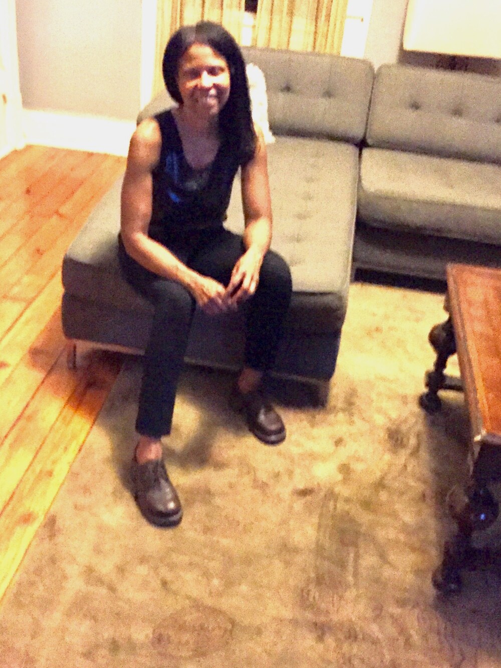 Leather textured top with form fitting slacks. Comfortable and slightly boyish shoes. Casual look for a Saturday night.