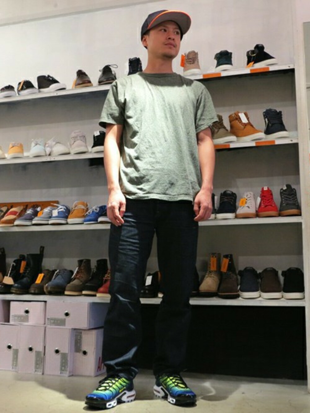 本日から予約会がスタートする、NIKE AIR MAX PLUSを履いてみました! 90年代にUSのFOOTLOCKERという大型スニーカー店のみで発売され、プレ値が付く程大人気だった1足です。 こちらのカラーは当時は発売されていない、今回の復刻に合わせてリリースされた新色です。 夏っぽいカラーリングなので、今日の様にデニムはもちろんショーツにもバッチリはまると思います! 店頭でも大人気ですよ!!!