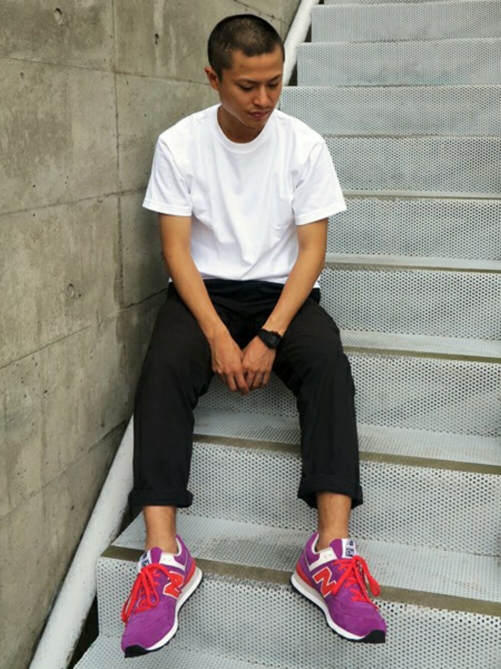 店頭で反応の良い"New Balance ML574 (ML574KPU)"を中心にコーディネートしてみました。 白の無地Tシャツと黒のパンツに派手なNBを合わせてみました。 誰にでも似合うコーディネートだと思います。 パンツの裾をロールアップしている所がポイントです。