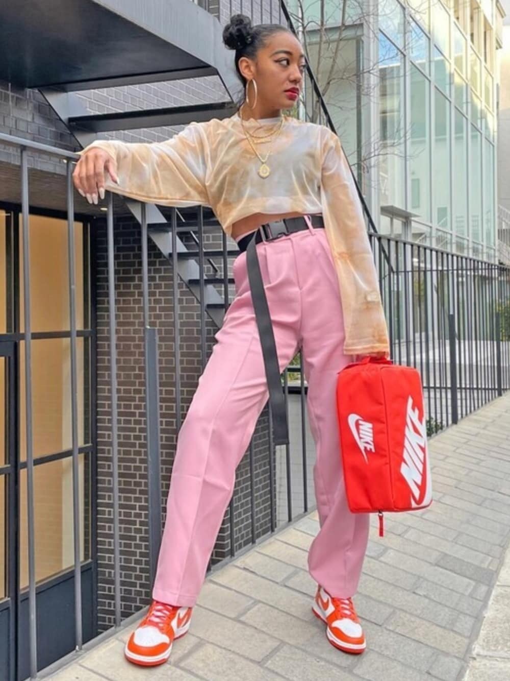 タイダイオーガンジートップスにPINKのボトムス、オレンジのダンクをカラフル配色であわせた春にぴったりな着こなし。
