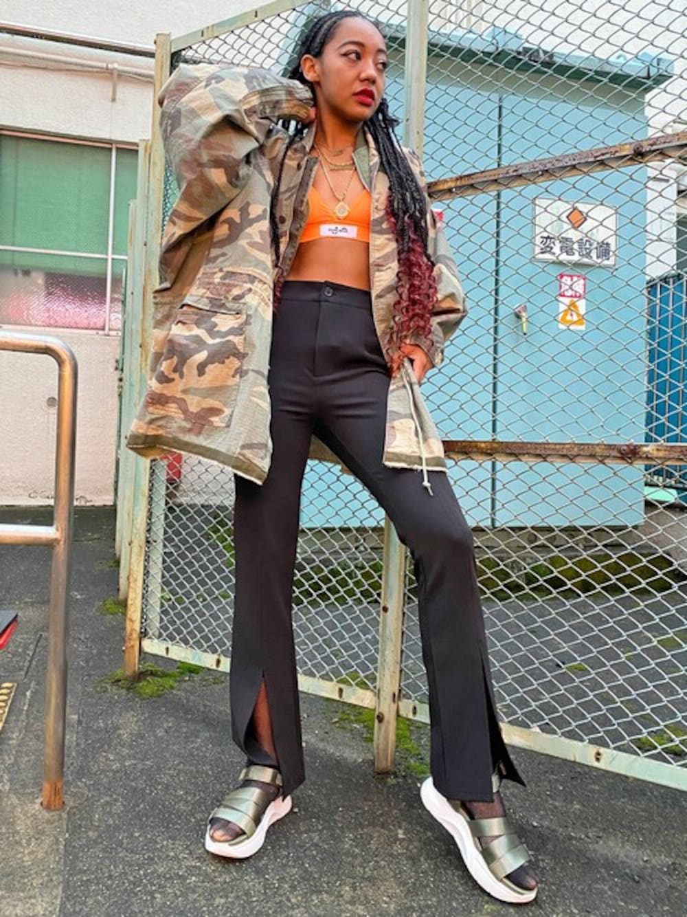 カモジャケットにブラトップをあわせた女性ならではのストリートライクな着こなし。