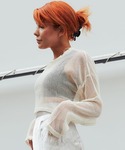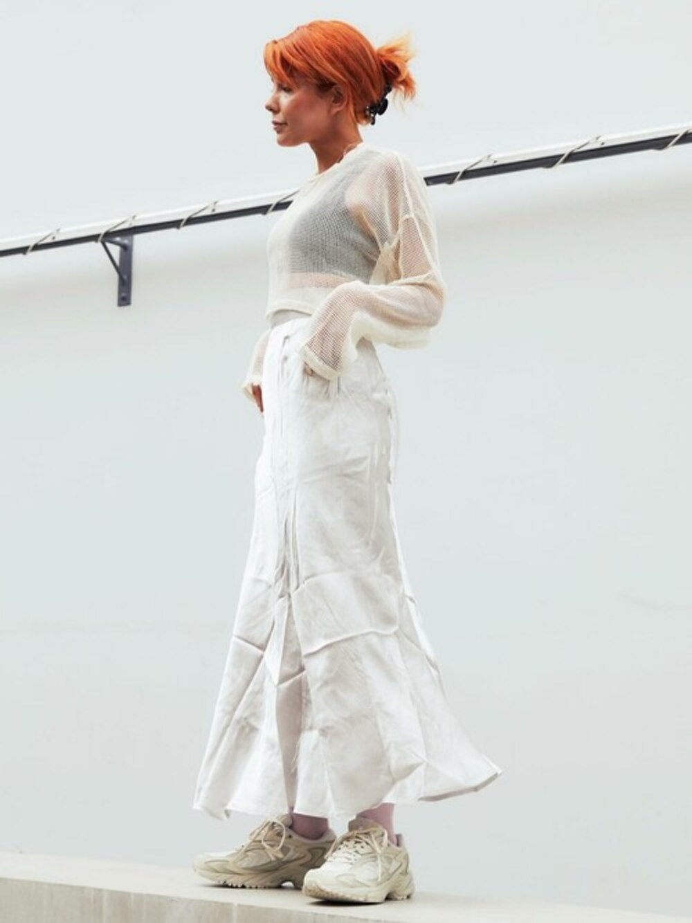 メッシュトップスで残暑も楽しむ秋めいたホワイトコーデ。足元はスニーカーではずして甘すぎずに