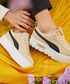 韓国ブランドとPUMAを合わせたスポーツミックスコーデ。オレンジとソックスのブラウン、スカートのベージュで秋感も演出
