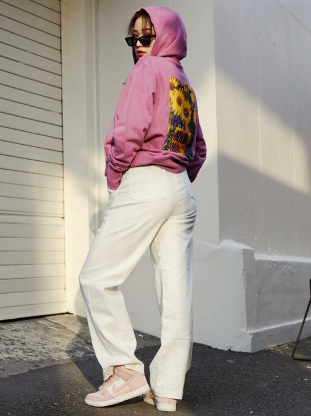 バックのグラフィックが特徴のNIKEフーディーをメインにしたストリートコーデ。