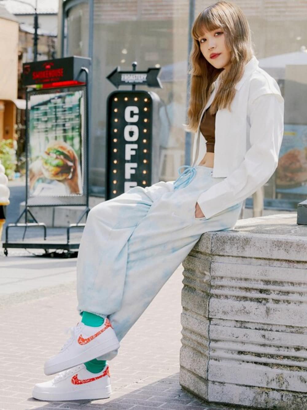 NIKEライトブルーのスウェットパンツが全体をさわやかに見せる初夏コーデ。暑いときは羽織をぬいで初夏の装いに♡