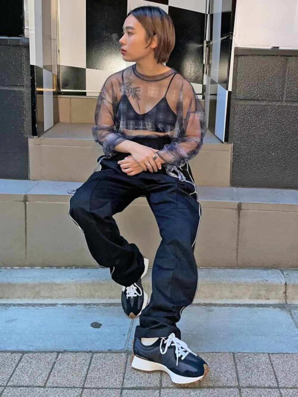 シースルートップスで今っぽさを出したモノトーンコーデ。足元はファッショニスタの注目ニューバランス327をチョイス♡