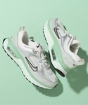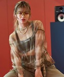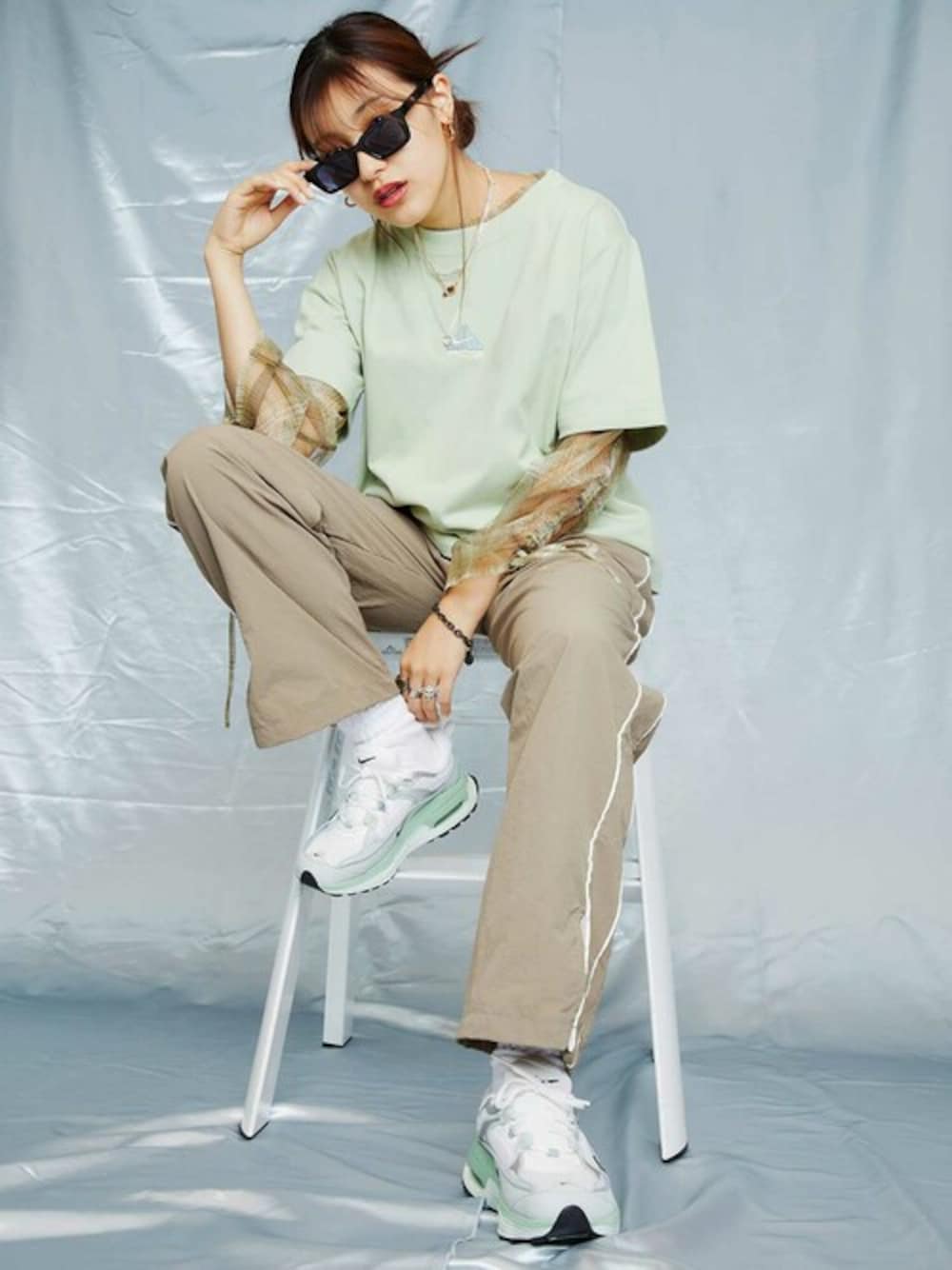 NIKEのトップスをオーガンジーシャツでレイヤード。絶妙なカラートーンがこなれ感を演出