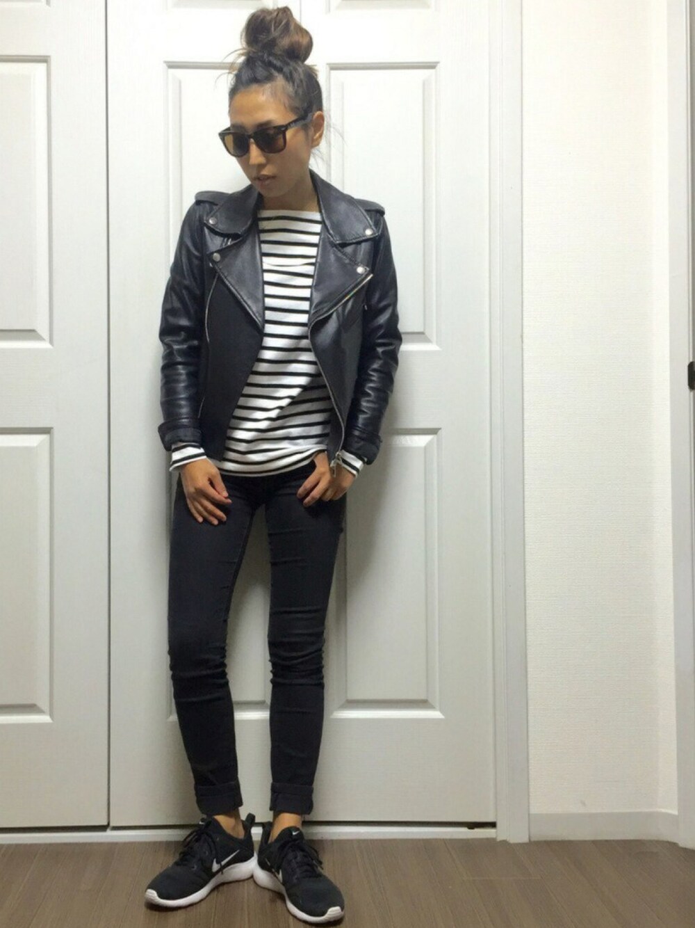 シンプルに♡ ライダースをかっこ良すぎずに着こなせるようになりたいです😁 スニーカーはずっと手を出してなかったけどデビューしました、遅い! おダンゴヘアーがなかなか決まらない💦