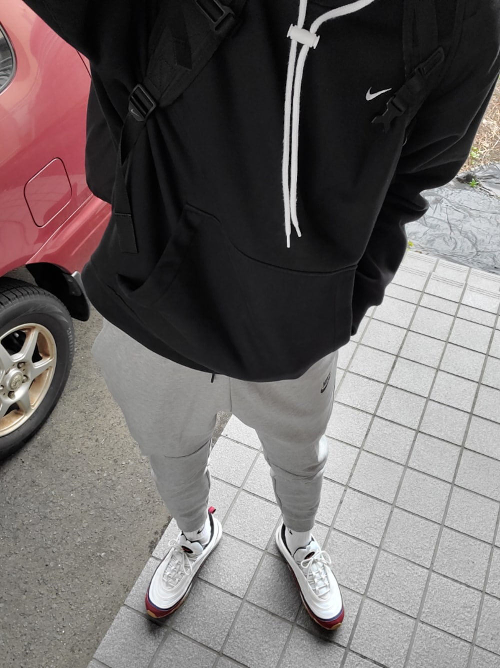 ちょっとそこまでコーデ。 相変わらず全身ナイキです笑 テックのパンツは形がキレイなので、だらしなく見えないとこが👌