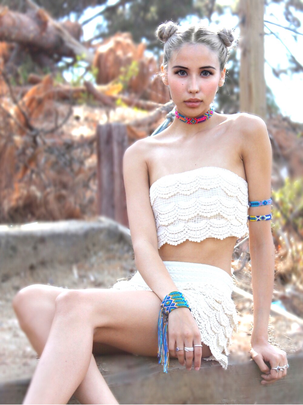 The 2 piece top and bottom are very soft in a light beige and very whimsical overlapped lace. The pieces are very feminine but at the same time edgy because of the design which allows me to show off my sexy side too