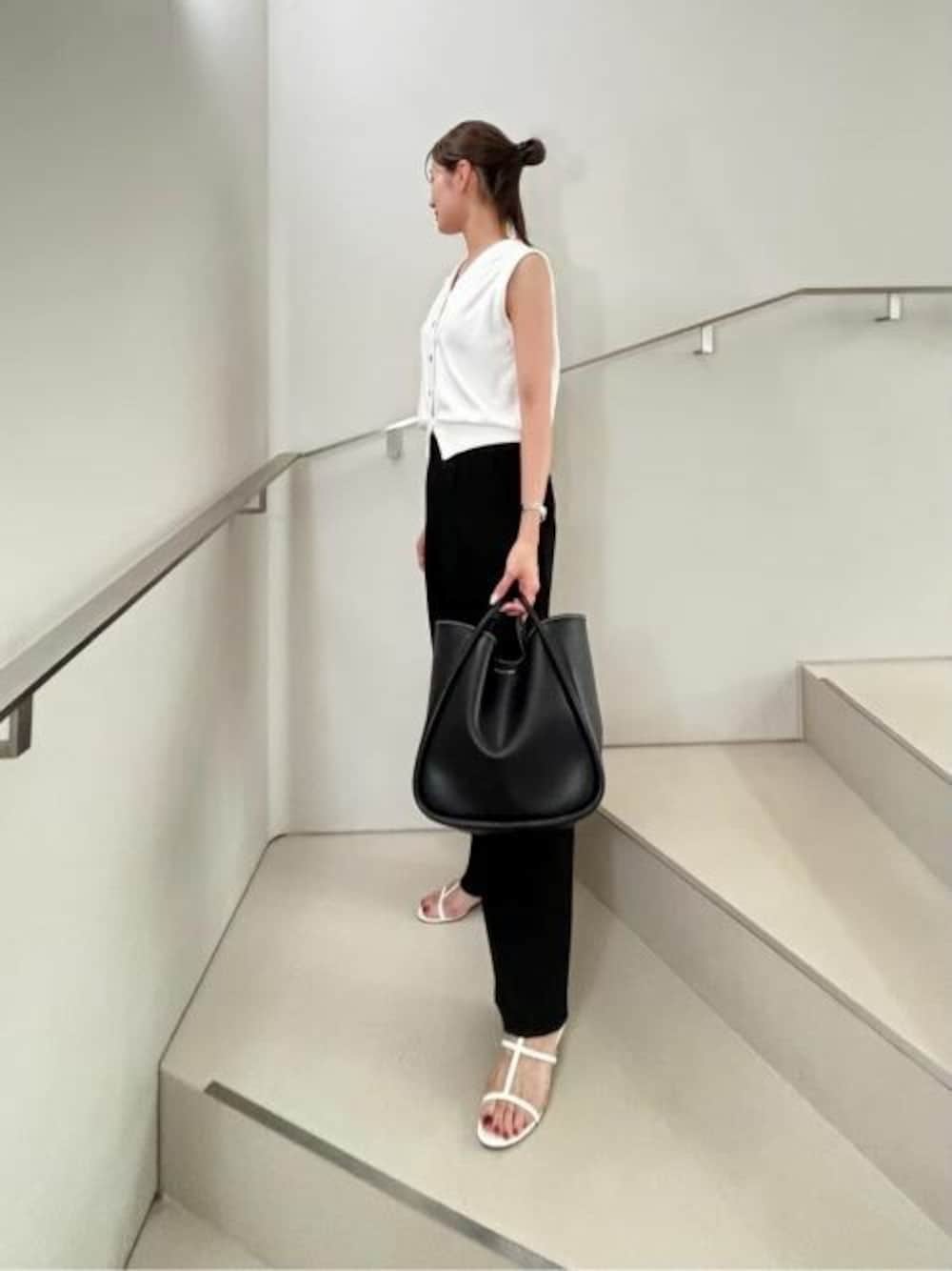 【バッグ】 大人気ビッグトートバッグ♡ A4サイズはもちろん、パソコン等も十分入る大きめサイズにマルチポーチがセットと非常に実用的です◎ シーズンやスタイルを問わずご使用いただけるシンプルでベーシックなデザインは、通勤通学にオススメ! 【シューズ】 ミニマルデザインのTバーサンダル。 肌見せとミニマルなデザインで夏らしさと上品さを演出してくれます♪ 低めのヒールとT字ストラップで安定した履き心地です◎