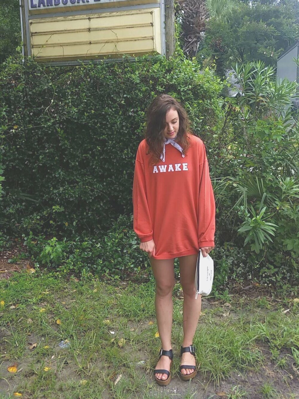 hand embellished sweater in a raw umber orange hue over shorts. Diptyque travel clutch and bandana scarf.