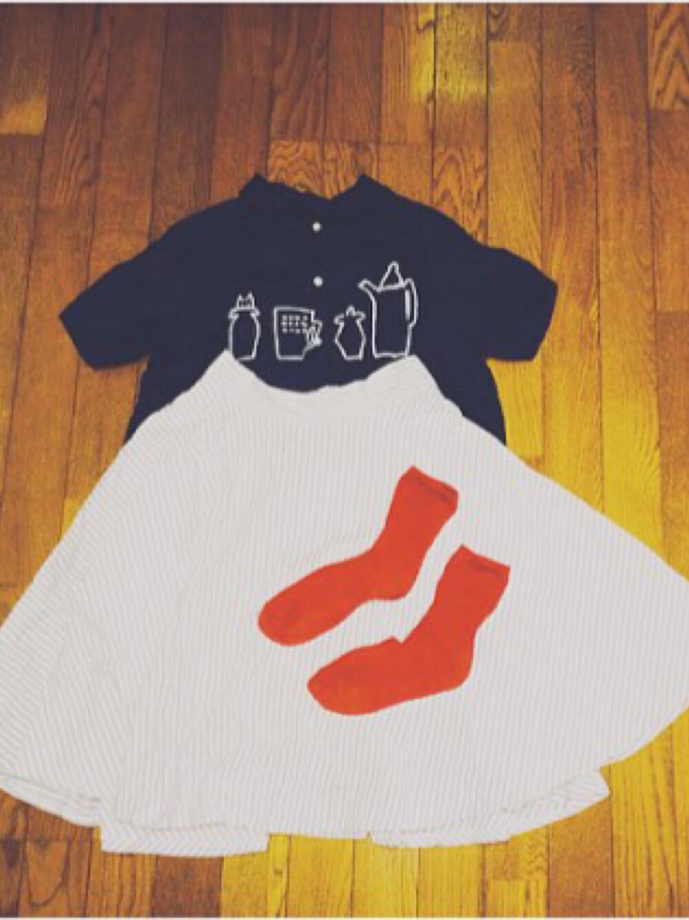 はじめましててて 🌞 遊び心のあるシンプルなコーデがすきです。 落ち着いたトーンに色味のある靴下を差し色にしてみました⁽ ˙˙̮ ⁾♩