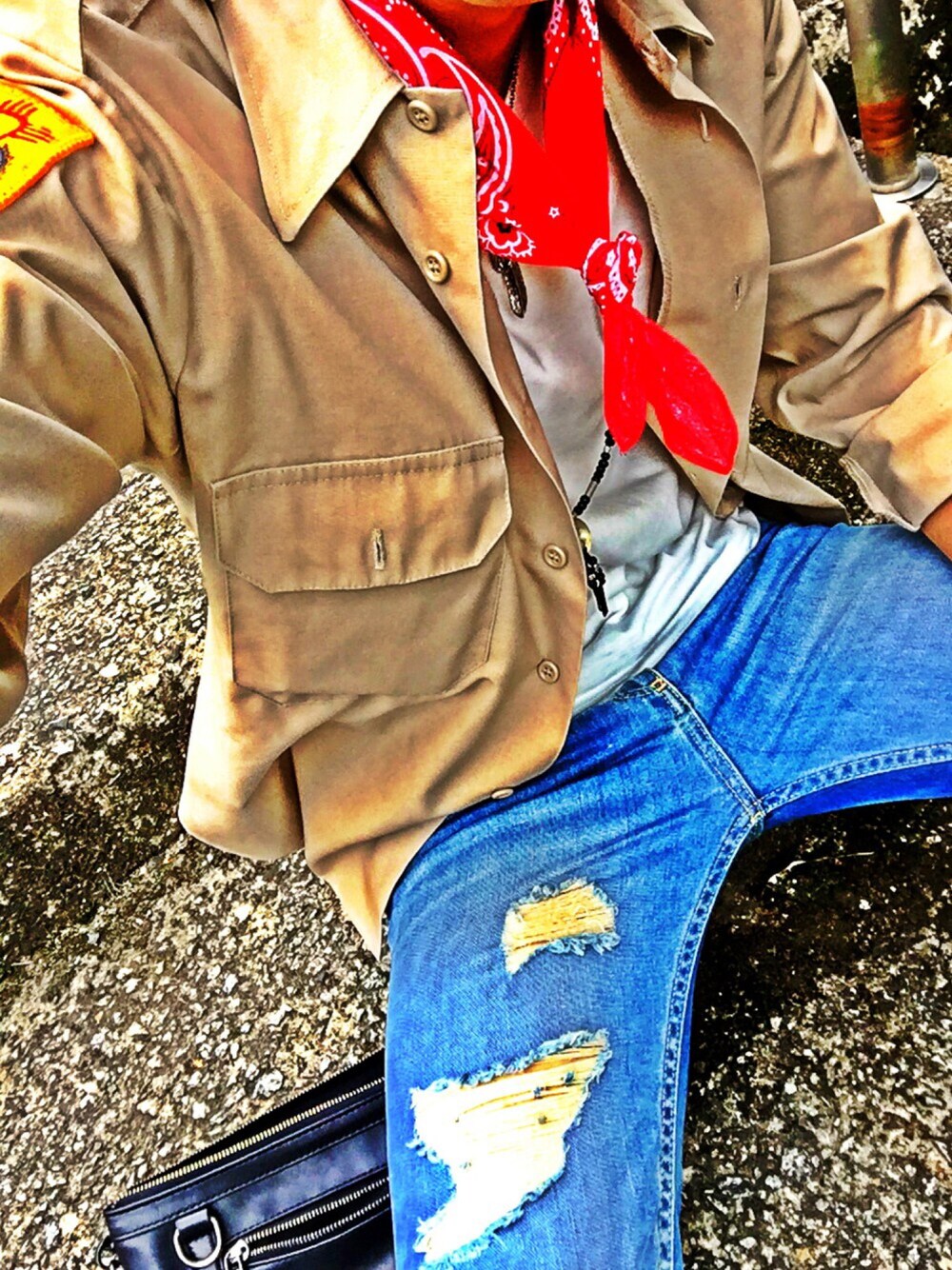 もう半袖で外出るには充分な気温になってきましたね(^O^) この季節はやっぱり明るい色を使いたくなりますよね! てことで、初めてバンダナに挑戦してみました♪ ボーイスカウト感出てますが、、笑 パンツは知り合いにダメージしてもらいましたo(^_-)O