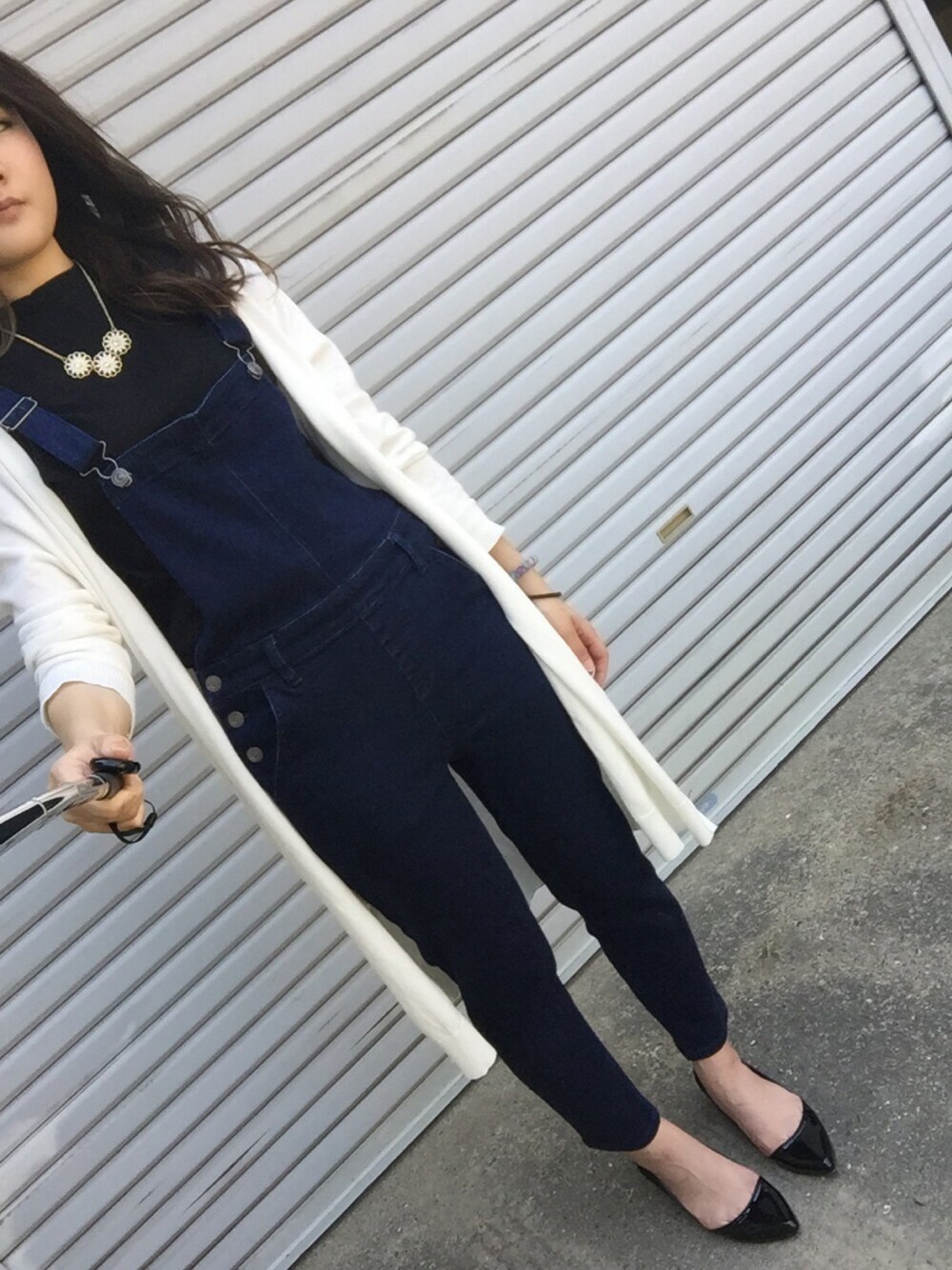 初デニムサロペット! ストレッチきいててとても履きやすいです◎ セールで安く買えました! 白シャツにするか悩んでロングカーデが 着たかったコーデになりました!
