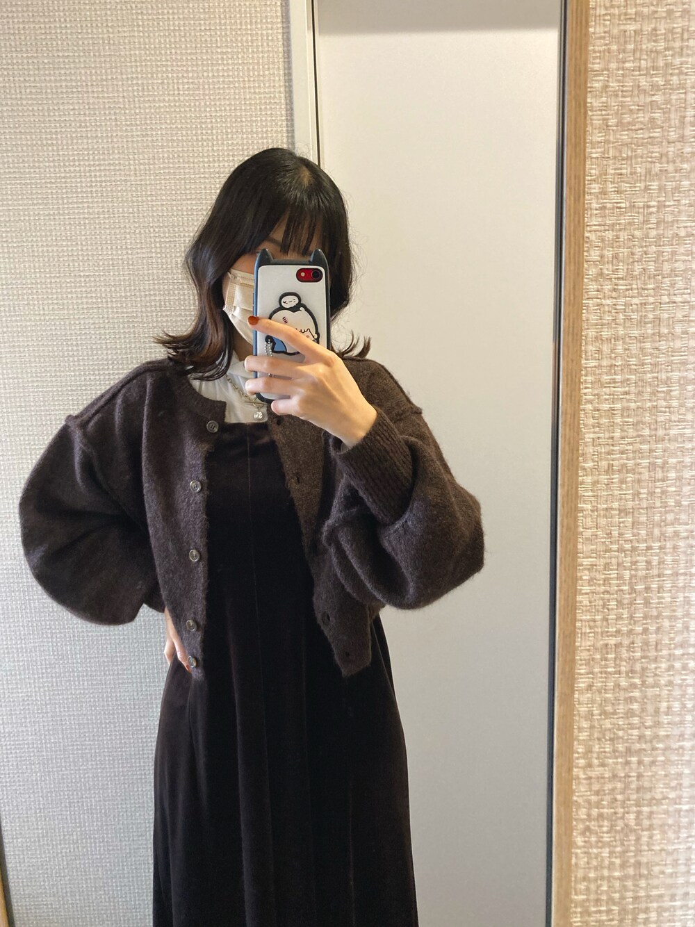 今日は大人っぽコーデにしました❕ カーディガンとネックレスは kastaneの22'福袋です🧏🏻♀️ ショート丈のアイテムは スタイル良く見えるのですきです❕ ベロアのワンピースも珍しいし可愛いので おすすめです ੯‧̀͡u\♡