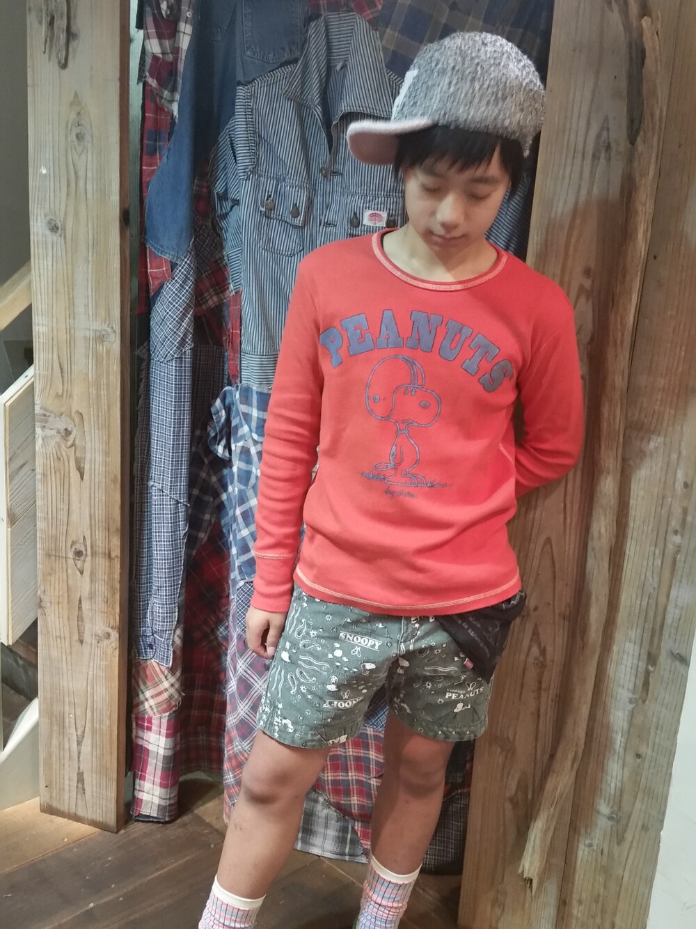 いつも見て頂き、ありがとうございます✨ 全身スヌーピーコーデです。半ズボンにキャップの斜め被りで、テーマはやんちゃ坊主です(笑)