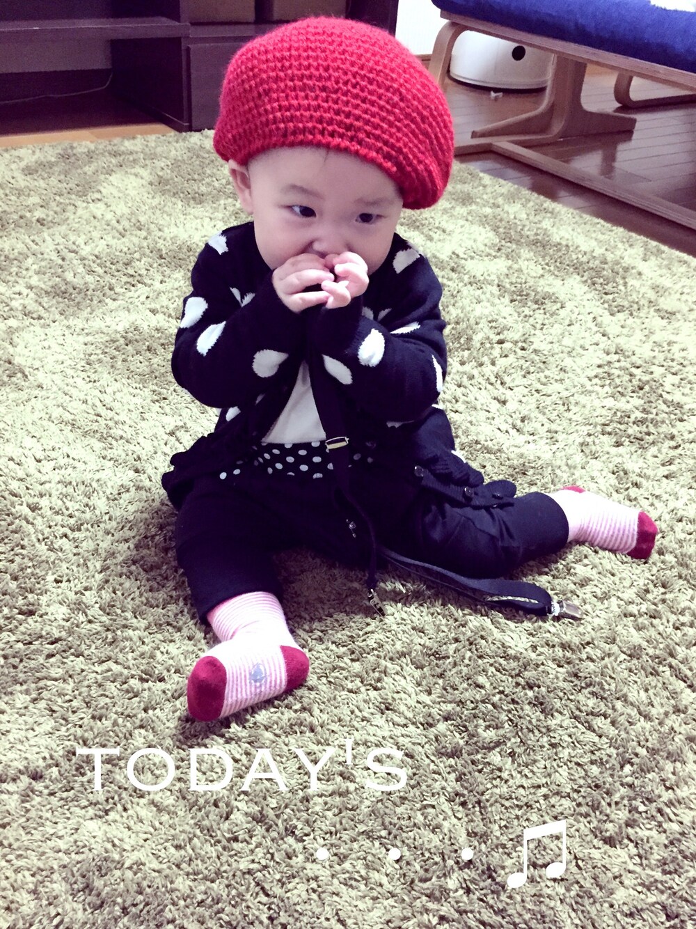 帽子 Handmade カーディガン 西松屋 パンツ 西松屋 くつ下 プチバトー 帽子がおもしろい形になりました。 大きいからか?還暦のお祝いをしているような気分になります。 サスペンダーをがじがじしてます。 取り上げると怒ります(-_-) 歯がちょこっと生えてきました。
