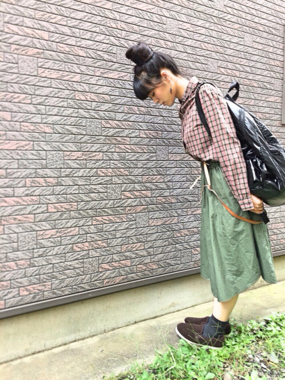 shirt : SHIPS skirt : HANSEL & GRETEL shoes : Nostalgic Garage bag : PORTER suspenders : 古着屋さん pierce : handmade (wood)