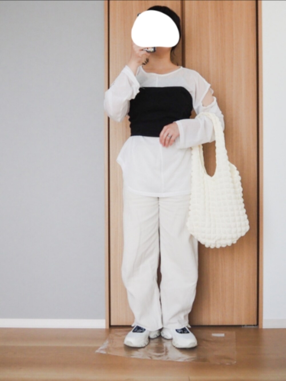 着用コーデ:370件mのTシャツ/カットソー「【WEB限定】シアー肩開きプルオーバー」を使ったコーディネート