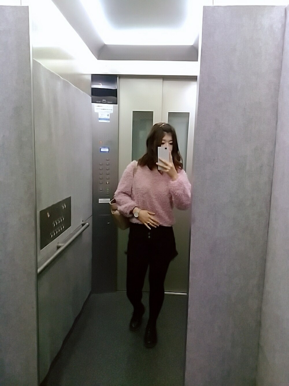 ピンク系のニット/セーター、ブラック系のデニムパンツを着用したレディースの秋コーディネートの1枚目の写真