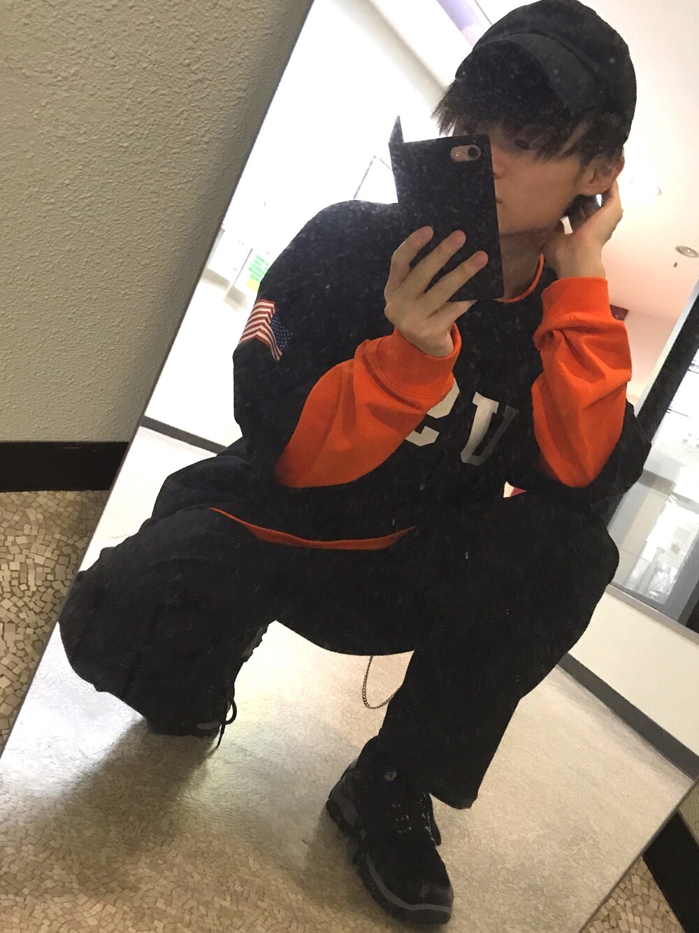 オレンジと黒の重ね着コーデ! トレッキングシューズにもオレンジが入ってます(撮り方下手ですみませんm(_ _)m) いいねやお気に入りしてもらえたら嬉しいです😊