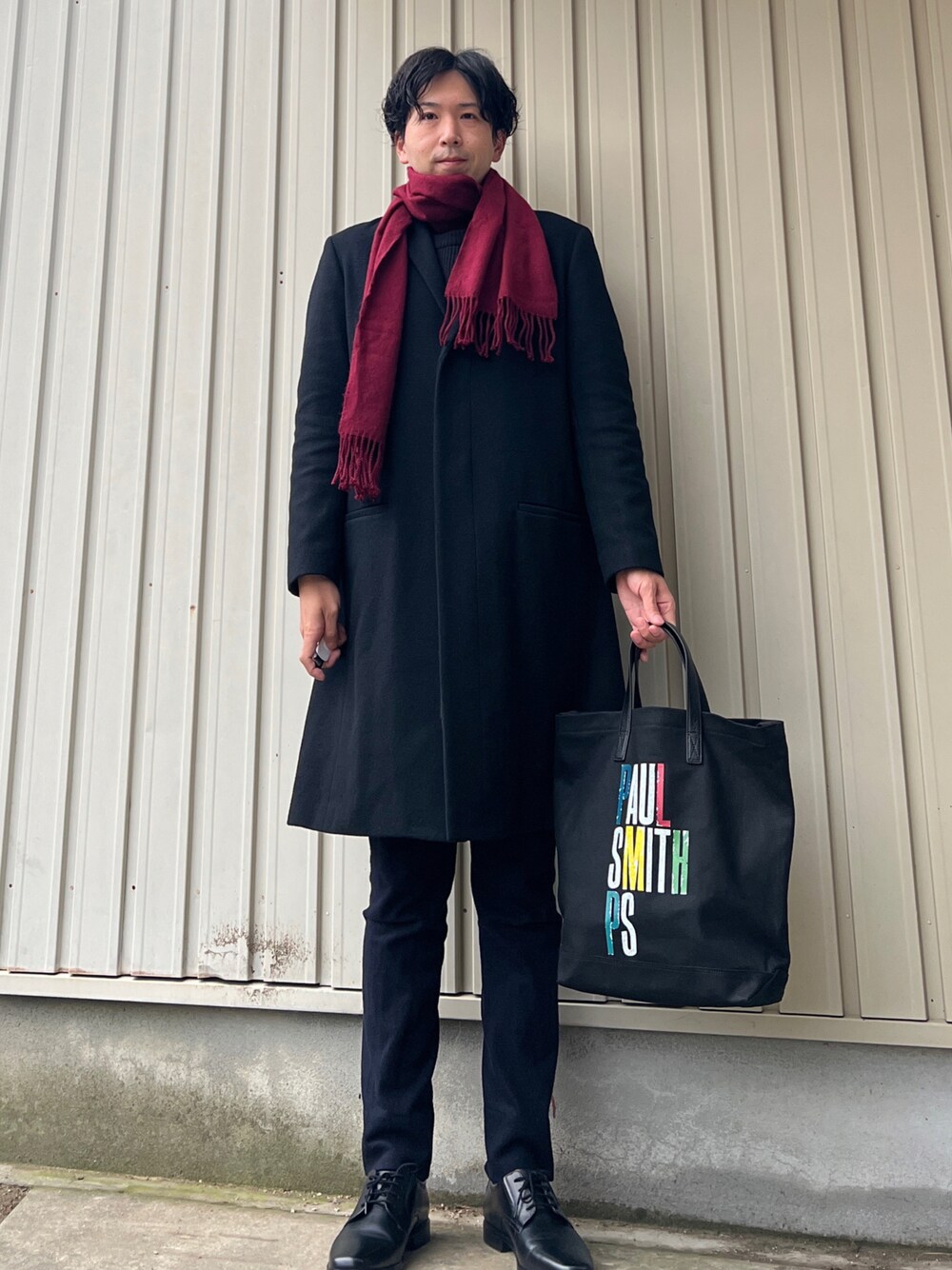 閲覧ありがとうございます😊 ユナイテッドトウキョウのチェスターコート着回しコーデ3部作完結編、前回のコーディネートにトートバッグを追加して、赤のマフラーを差し色にして巻きました! マフラーの巻き方は色々ありますけど、これは適当に巻きました💦
