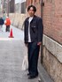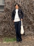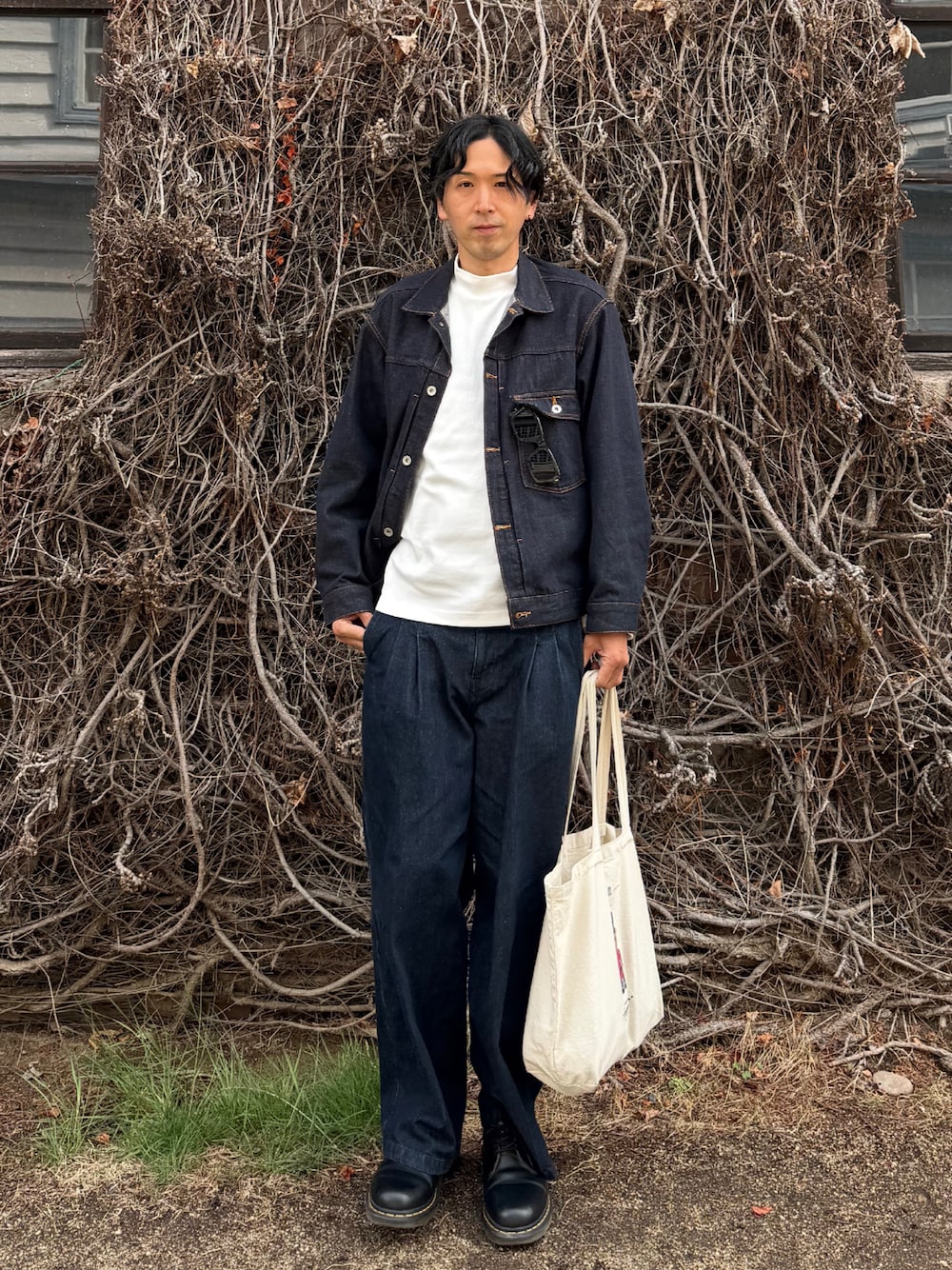 デニムジャケットとデニムスラックスの上下はそれぞれ別ブランドで、よく見ると色が少し違います。 着こなし自体はシンプルです。