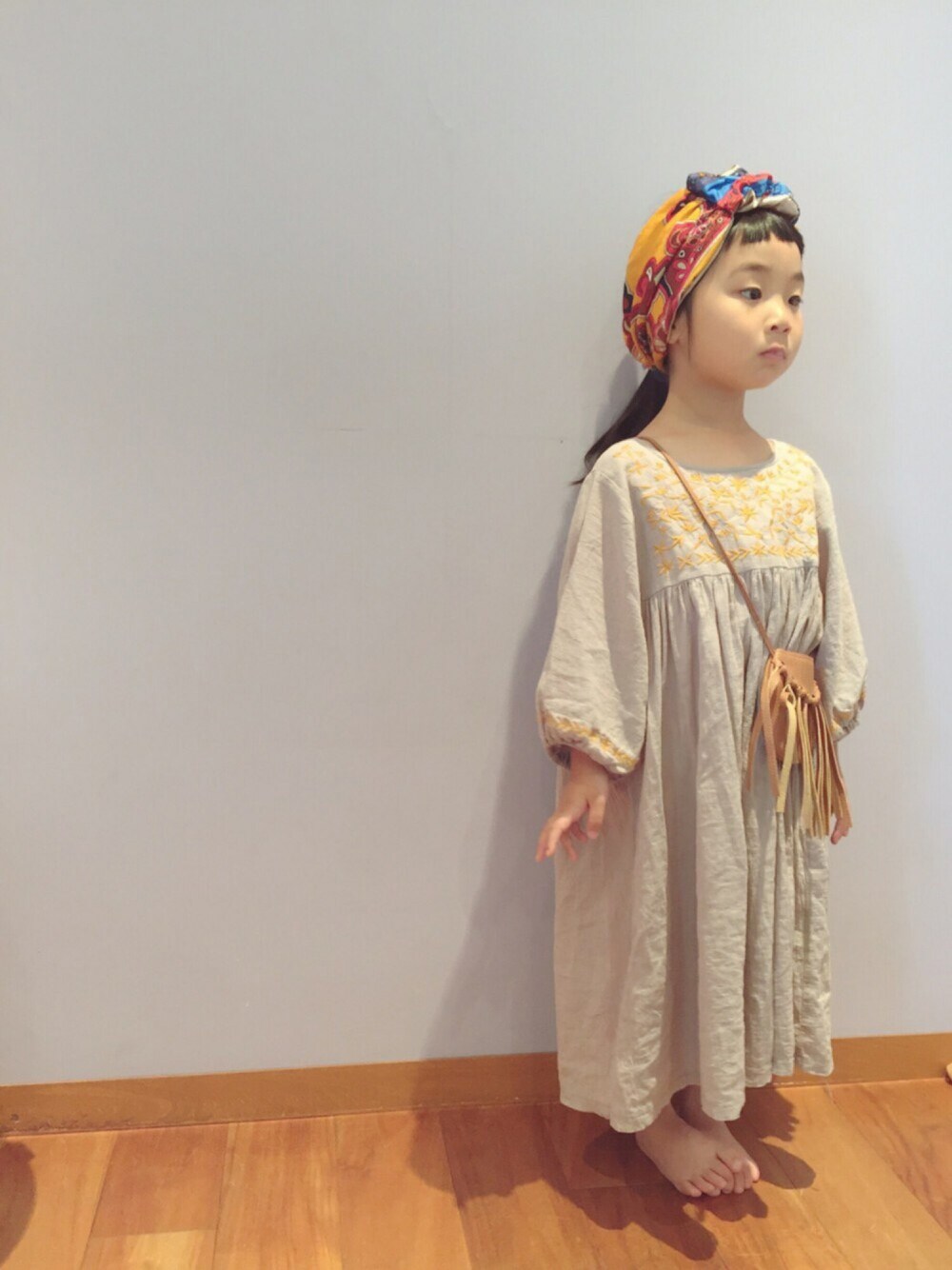 ベージュ系のワンピース、ゴールド系のヘアバンドを着用したキッズの夏コーディネートの1枚目の写真