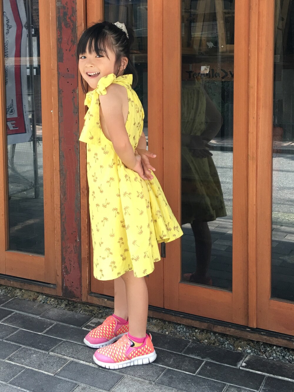 ハウのワンピース。夏らしい女の子スタイル。サンダルは長く歩けないのでスニーカーです。