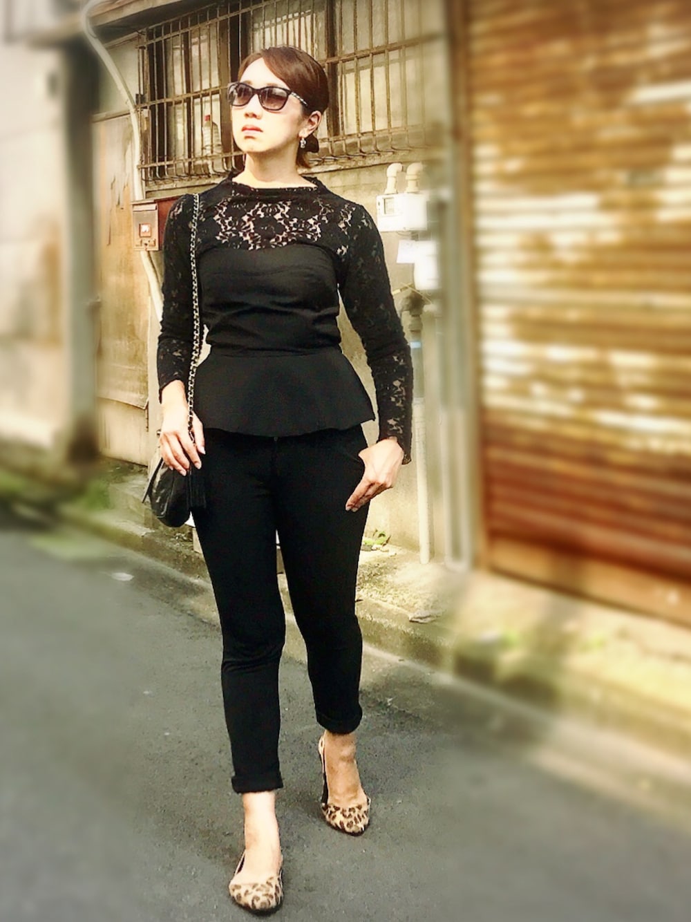 FNOレセプションコーデ。 GU のレーストップスにビスチェはブラックで 大人なパーティースタイリング。 オールブラックも素材の違いで華やかさをプラス。 足元はレオパード柄でコーデにアクセントを。