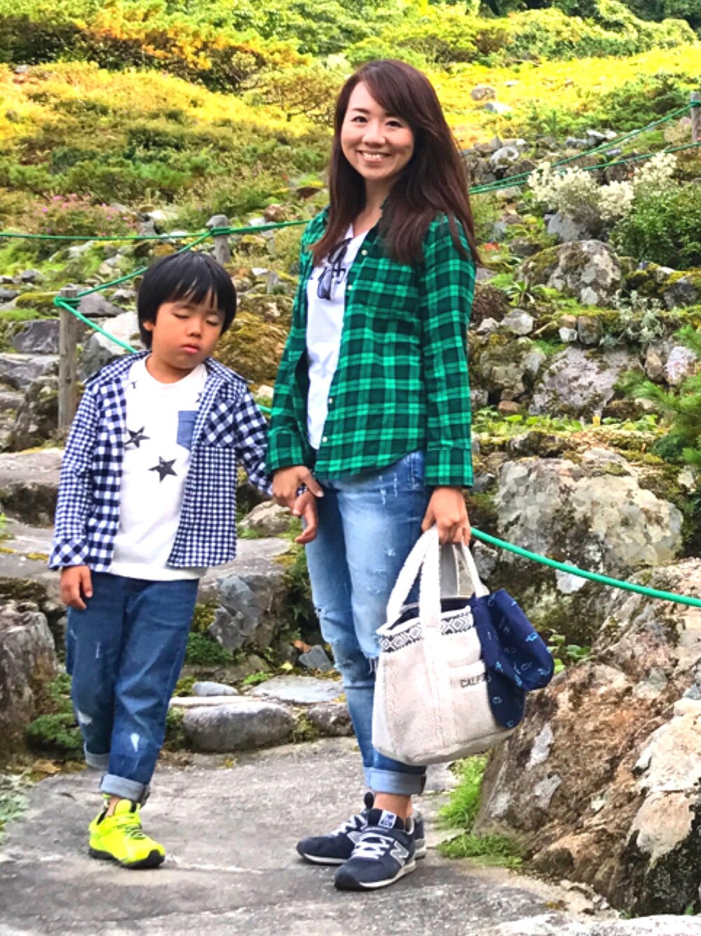【秋のピクニックコーデ】 チェックシャツ×クラッシュデニムで親子リンク たくさん歩いてたくさん笑いました。